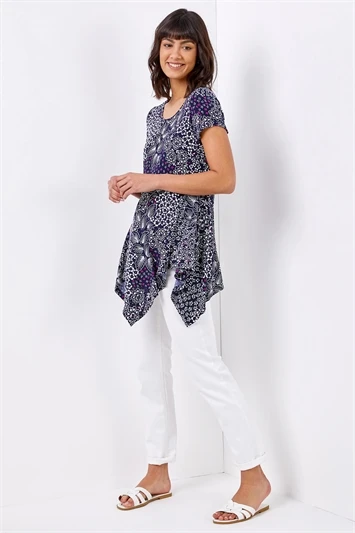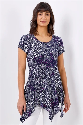 Update your Spring casualwear with this versatile wardrobe staple. Featuring a dragonfly placement print and contrast asymmetric hemline, this tunic top is made from an easy breezy lightweight material. The short sleeves are finished with a delicate button detail whilst the flattering hanky hem silhouette is brilliantly flattering on all. Throw this over your favourite cropped trousers for a Summer holiday or jersey leggings for an everyday go-to style.