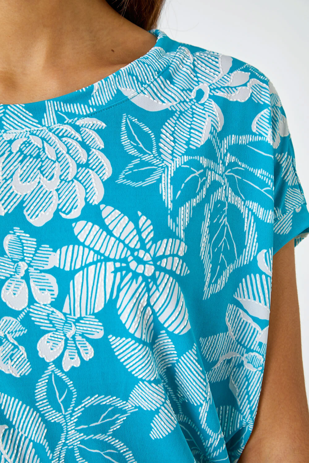 In a bright, on trend colour this top is adorned in an intricate, textured floral print. Cut from a comfortable, stretch jersey fabric this piece features a modest round neckline and grown on cap sleeves. Designed in an oversized style, this piece ensures a loose and comfortable fit. Designed to pull on overhead, this top is perfect paired with cropped stretch trousers and simple Summer sandals!