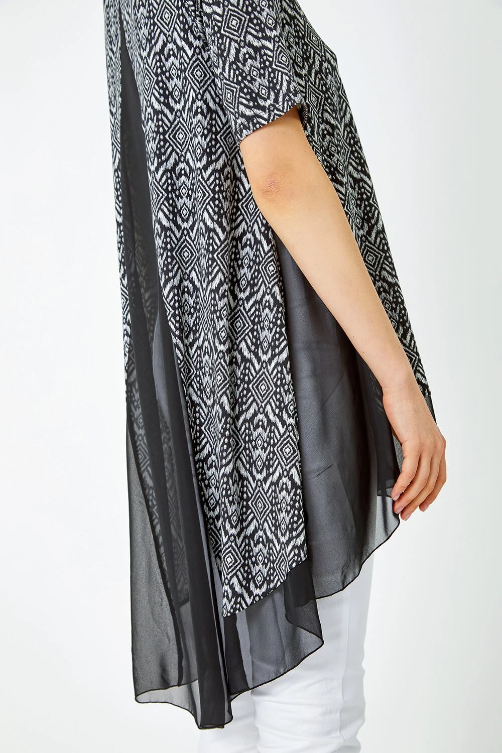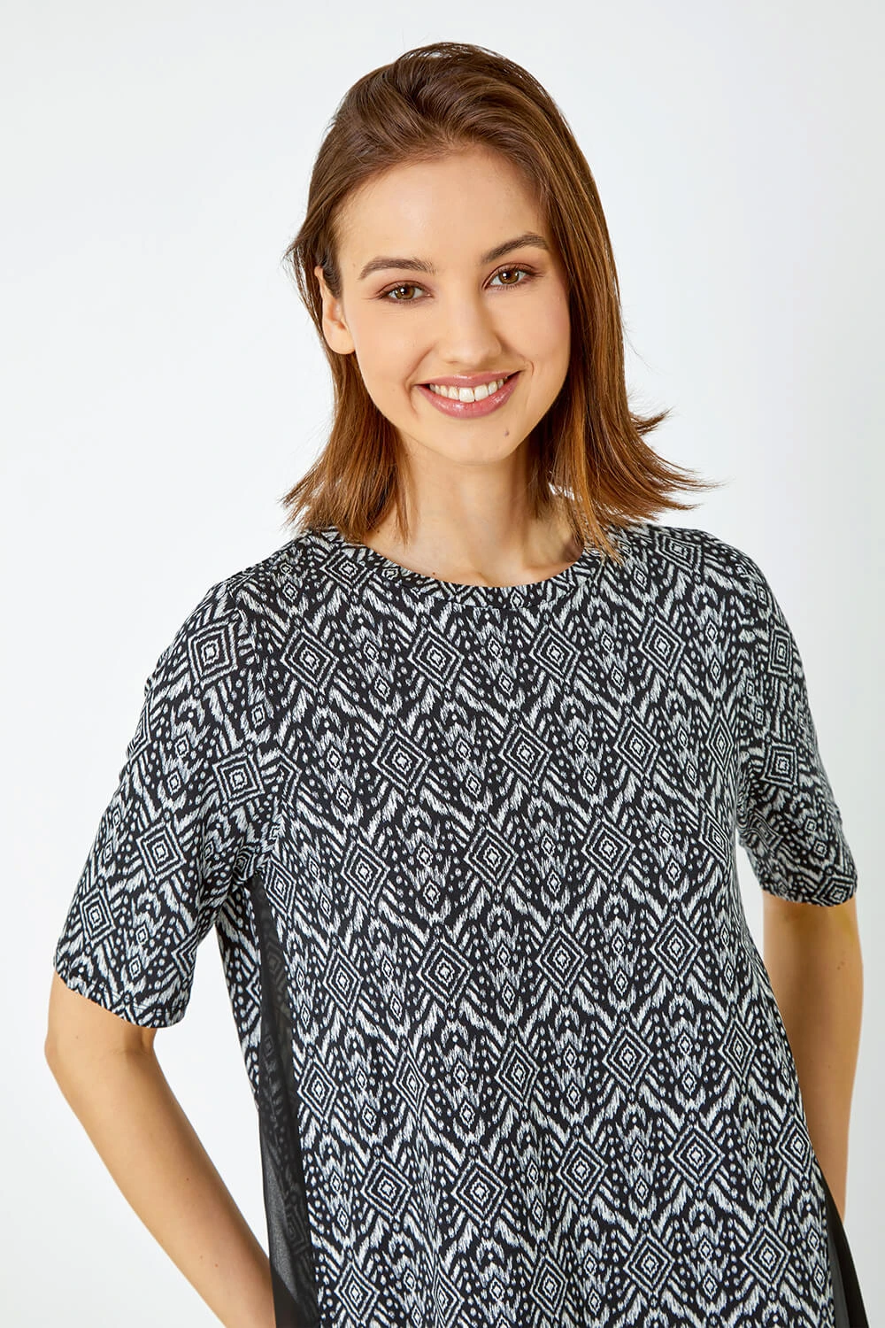 Adorned in an intricate Aztec print in a subtle complimentary colour palette this tunic top is ideal for the Summer months. Cut from a soft and comfortable stretch jersey fabric this piece features a modest round neckline and simple short sleeves. A contrast chiffon hem adds interest while its tunic length provides extra coverage, making it perfect to pair with our cropped stretch trousers. Simply add trainers for a Summer ready style!