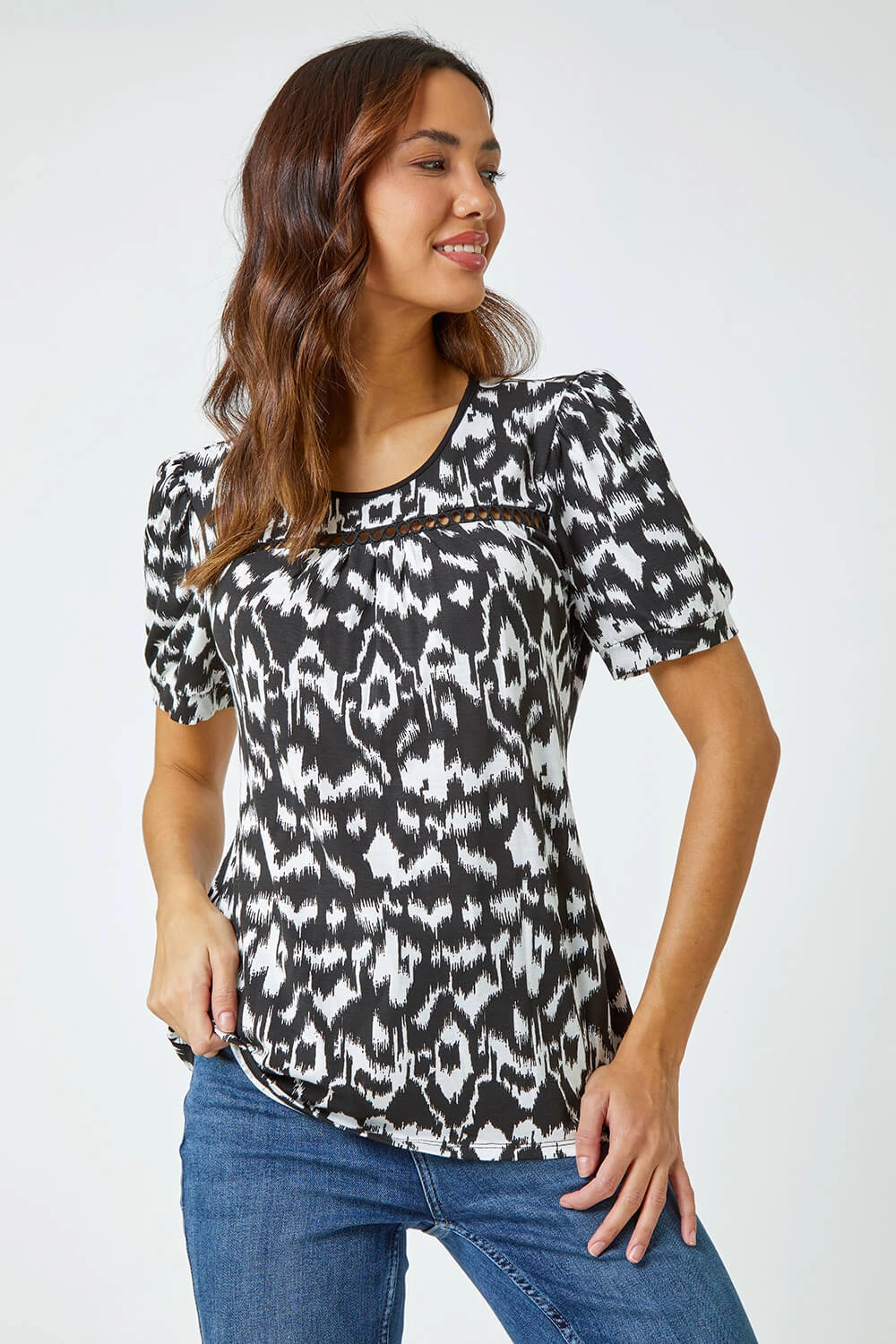 Adorned in a striking Aztec print, this top features a simple round neckline with contrast binding and short, puff sleeves finished with elasticated cuffs. Delicate ladder lace detailing is seen across the front of the piece, showing just the right amount of skin. Cut from a stretch, jersey fabric this top is comfortable and easy to wear. Simply add jeans and sandals for an on trend, off duty look!
