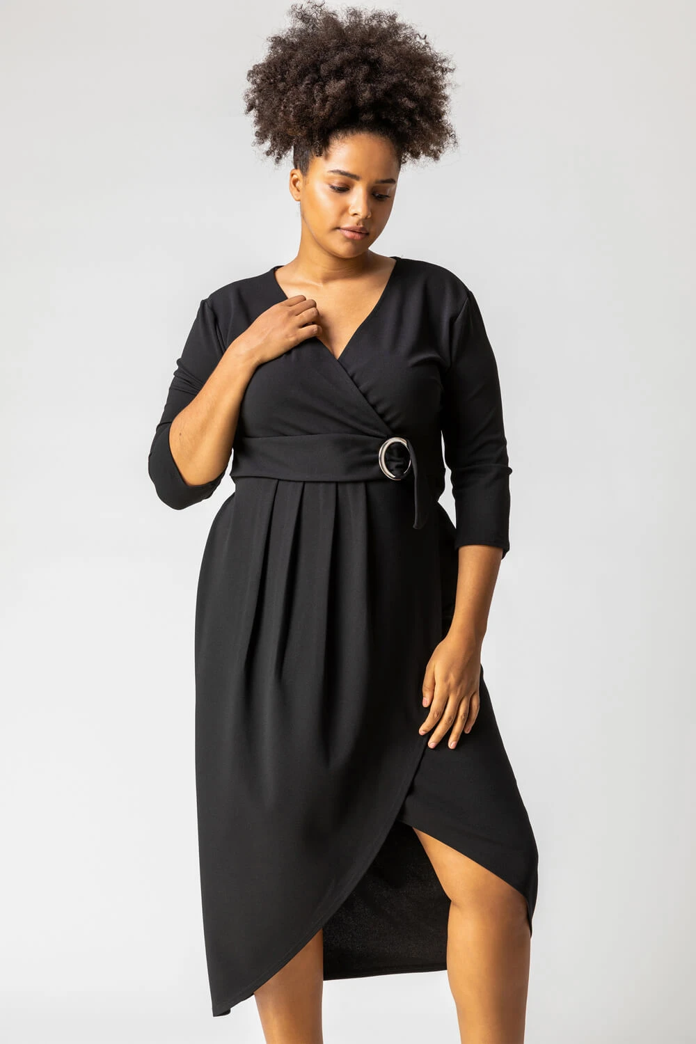 Ooze sophistication with this Roman Curve wrap midi dress, perfect for a multitude of different occasions, this dress is the ultimate wardrobe essential. Made from a comfortable scuba fabric, this pretty v neck dress also features a light waist belt with a ring detail and ¾ sleeves. Paired with a blazer or heels and a necklace, this dress can take you from desk to dinner with just a change of accessories.