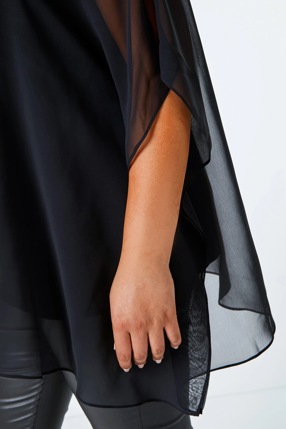 Add some feminine fabrics to your curve collection with this chiffon overlay top. Crafted from a floaty, chiffon material, this piece is cut into a relaxed shape with short batwing sleeves and a modest round neckline. This is designed to pull on overhead making it perfect for those last minute party plans. Pair with leather look trousers and heels for a sophisticated and understated look!