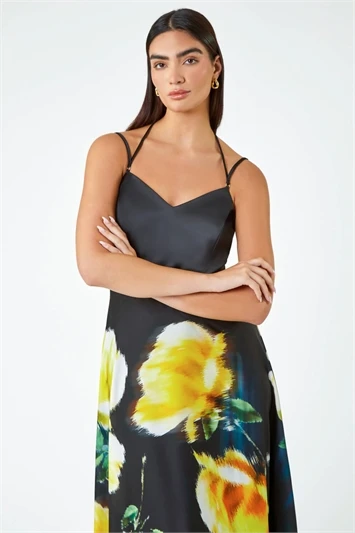 Add some floral romance to your occasionwear with this wrap detail knee length dress. Adorned in a timeless flower pattern that’ll be sure to wow your party guests, this subtle fit and flare dress is the perfect choice for any Summer occasion. Detailed with gathered draping from the waist, a classic round neck and a v-back, this easy to pull on dress has a stretch fabric that is so comfortable. The sleeveless shape is perfect for the warmer season whilst the twist detail cinches you in. Pair this piece with some strappy heels for a look that screams Summer glamour.