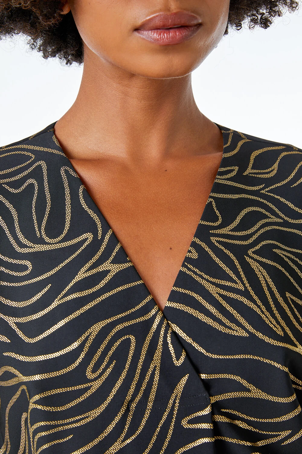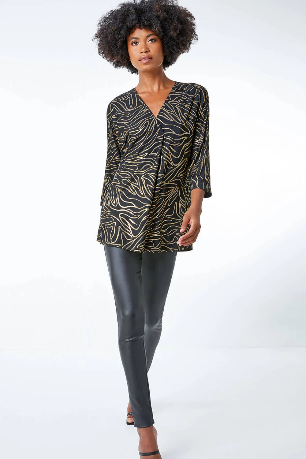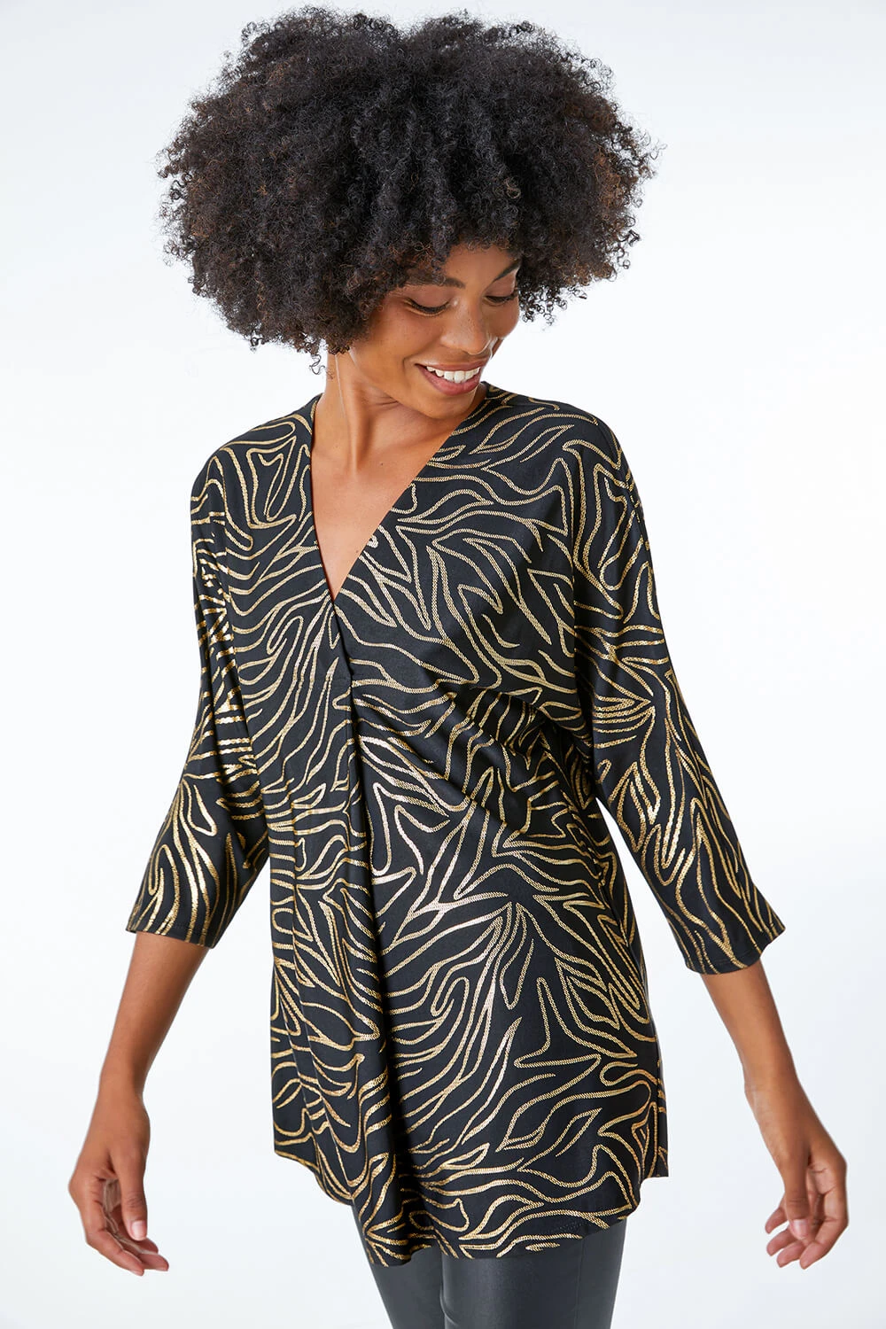 Get party ready with this metallic print tunic top. Cut from a stretch jersey fabric, this piece is designed in an oversized, tunic style for extra coverage and comfort. It features a feminine v neckline and fun ¾ length sleeves. It’s adorned in a striking metallic print that catches the light beautifully. Pair with leather look leggings and heels and you’re good to go!