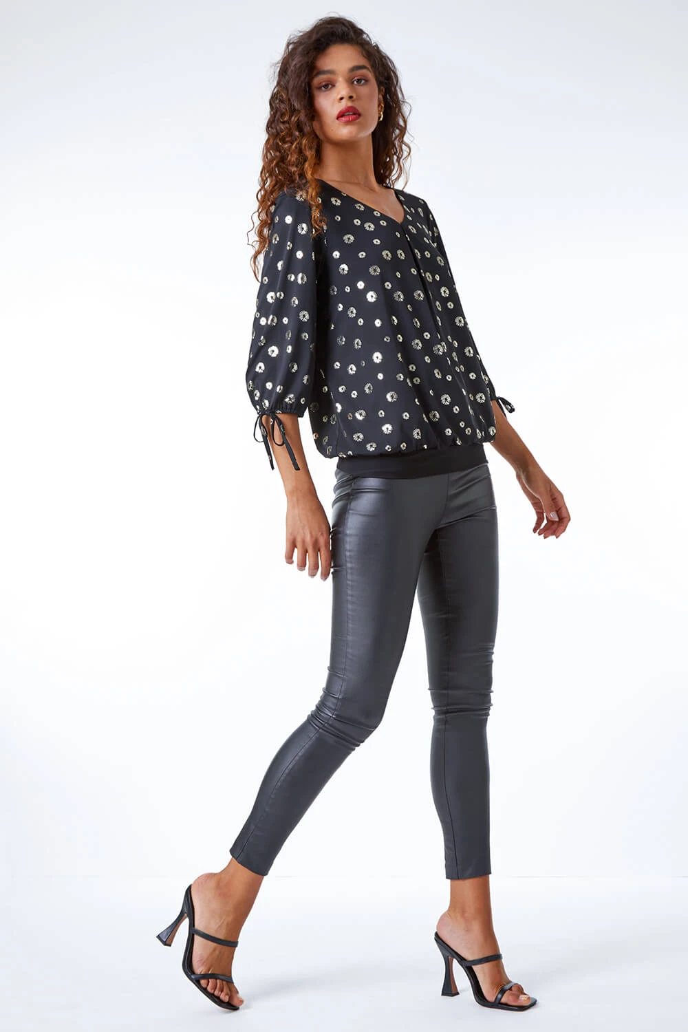 This metallic print blouse is the perfect party number. Crafted from a stretch jersey fabric this top has a blouson hem line and fun ¾ sleeves with tie detail. It features a feminine v neckline with front pleat detail. Adorned in a metallic spot print this top is sure to turn heads. Add jeans and heels for a party perfect look!