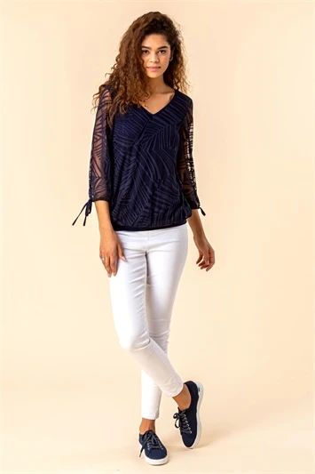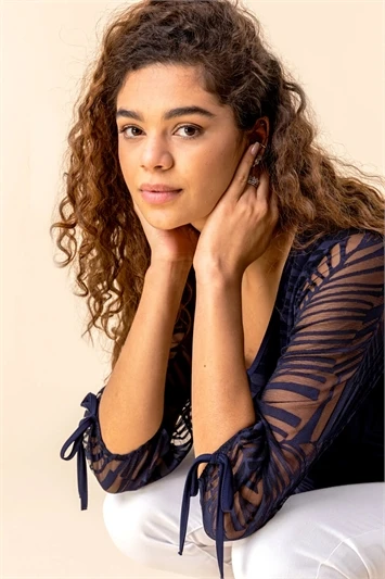 Make heads turn this season whilst wearing elegant prints and feminine silhouettes, this burnout print top will make a statement. Featuring a v-neckline and 3/4 length sleeves, this stretchy style mesh top has a blouson elasticated hem and mock bow ties to sleeves for added flair. Pair with smart trousers and boots for a chic workwear outfit or pair with a skirt and heels for a date night alternative!
