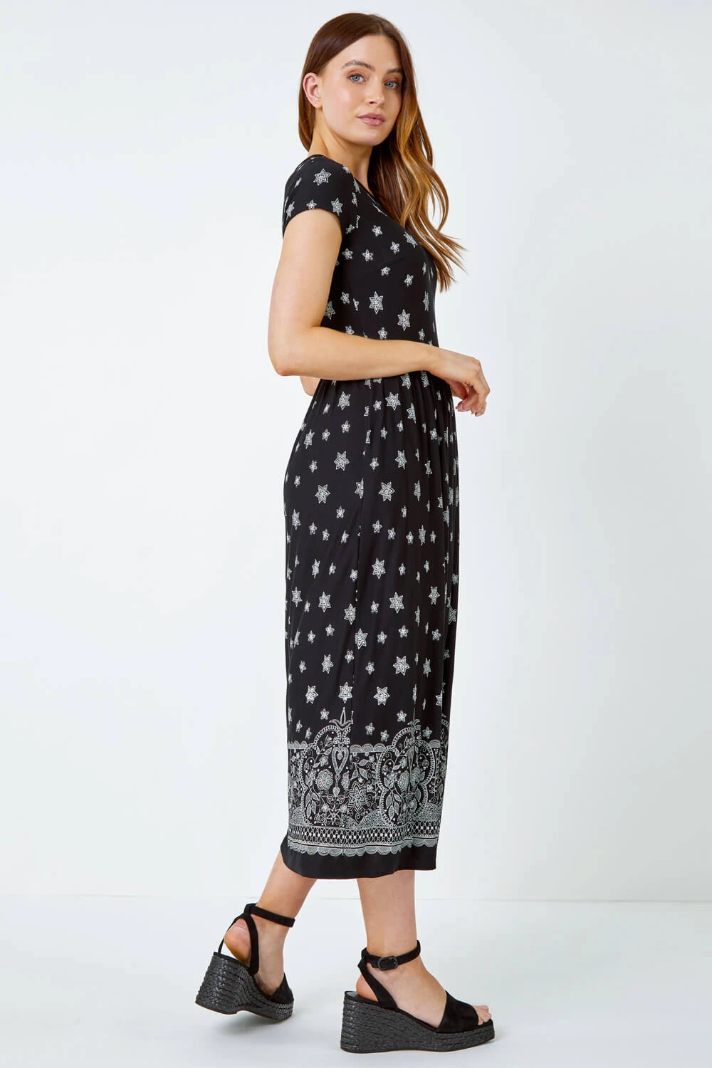 An essential addition to your casual wardrobe, this versatile dress is a must-have for the Summer months. Designed in a relaxed shape, from a comfortable stretch jersey fabric this dress features a modest round neckline and sweet short sleeves. Adorned in a paisley print motif this dress is finished with a bold border print at the hem. It falls in a fit and flare shape to a subtle midi length. Pair with sandals and a lightweight jacket for an effortless look!