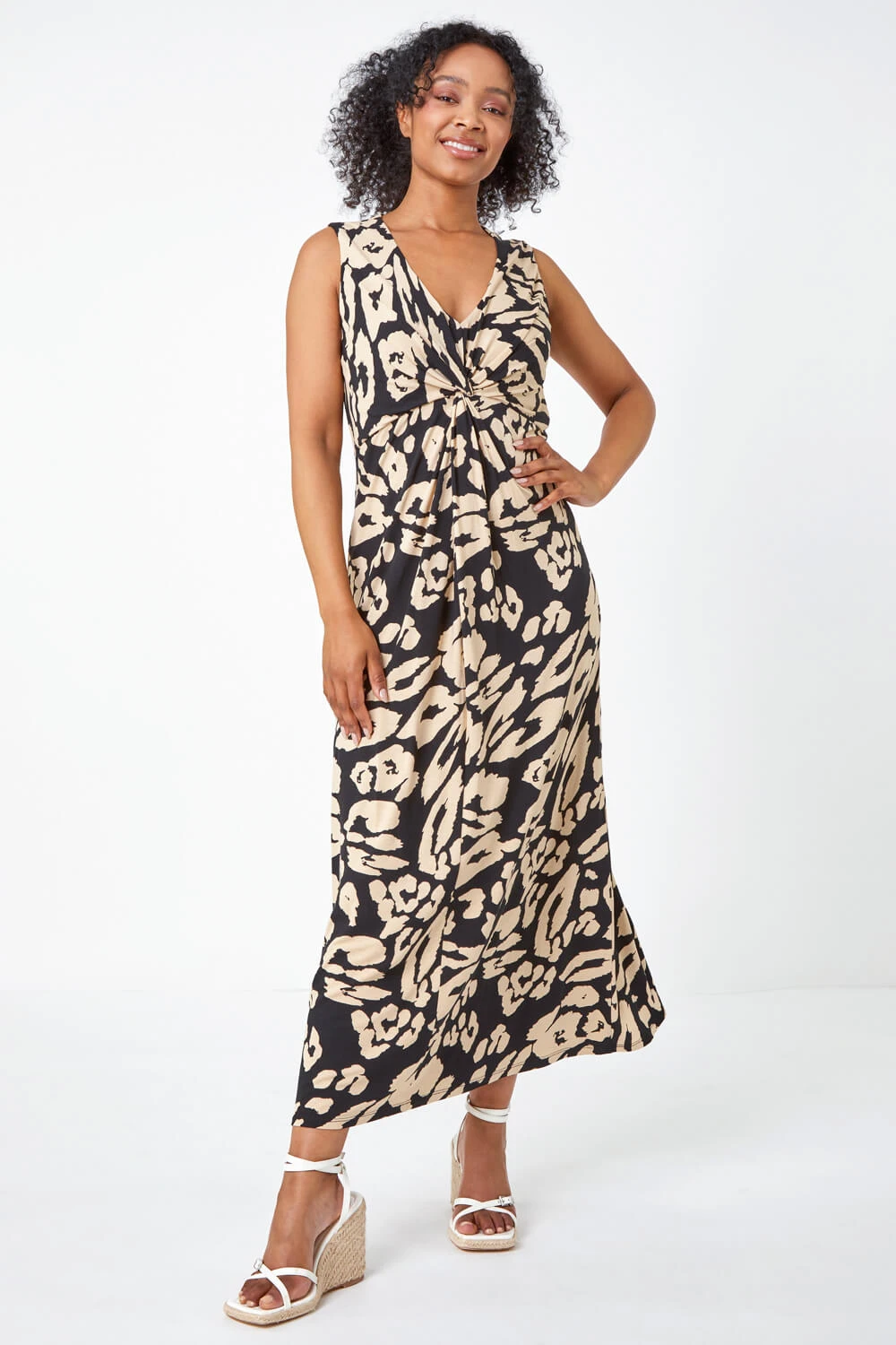 New in for our Spring Petite range, this twist front maxi dress is simple yet sophisticated. It falls at a flattering floor length with a v-neckline, a twist knot detail front creates flattering pleating at the waist which falls to the hem. Feminine and cool for the Summer, this style has a sleeveless body and stretch jersey silhouette, making it easy to pull on. The bold leopard print is so easy to wear dressed up or down, just add wedges for your holiday looks.