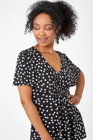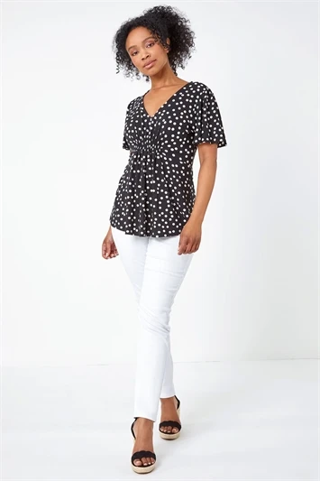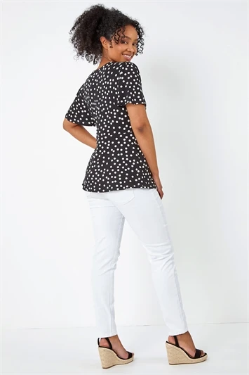 Spring into the new season in style with a pop of print and a pretty silhouette! This Petite midi dress is adorned with spots and has a flattering v-neckline. Topped off with a shirred waist to the front, this style is crafted from a stretchy jersey with a feminine fit and flare shape. The dress is easy to pull on for those everyday occasions with floaty short sleeves for all day comfort. Transition into Summer by adding a denim jacket and your fave sandals.