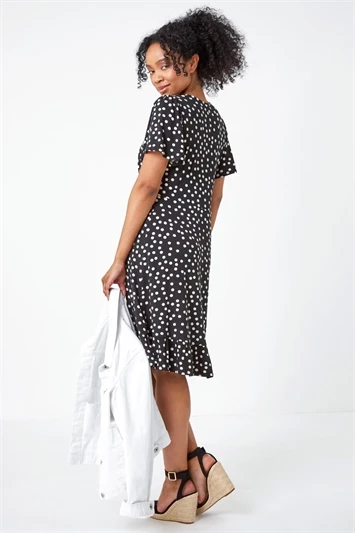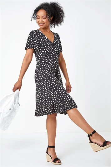 Get spotted in this classic polka dot print midi dress! Cut from a cool stretch jersey fabric this dress features a feminine v neckline and is designed in a sun ready sleeveless style, complete with comfortable shirred straps. Adorned in a playful polka dot print this dress has an elasticated waist for comfort and shape, while the skirt falls to a modest midi length in a fit and flare shape. Designed to pull on overhead, simply pair this dress with a lightweight jacket and sandals for effortless holiday style!