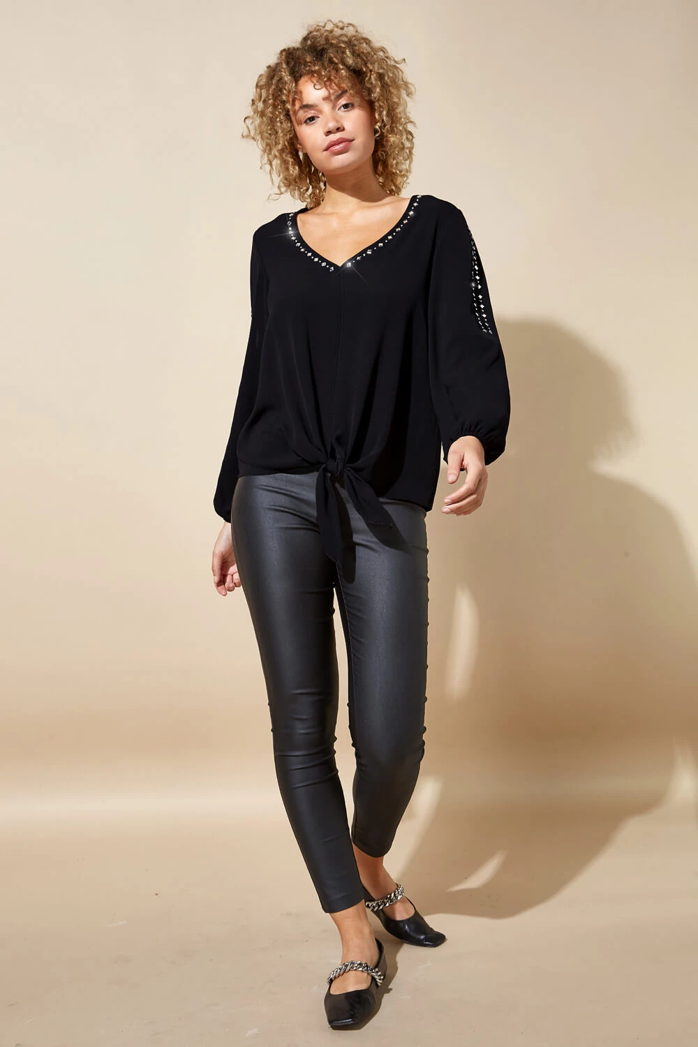 A much-loved silhouette with sparkling embellishment, this 3/4 sleeve top is bound to take your casualwear to new heights! This sophisticated pull-on blouse is features a tie front waist and sparkling stud embellishment along an elegant v-neckline. This top is the perfect smart casual outfit finisher for work or play throughout the new season.