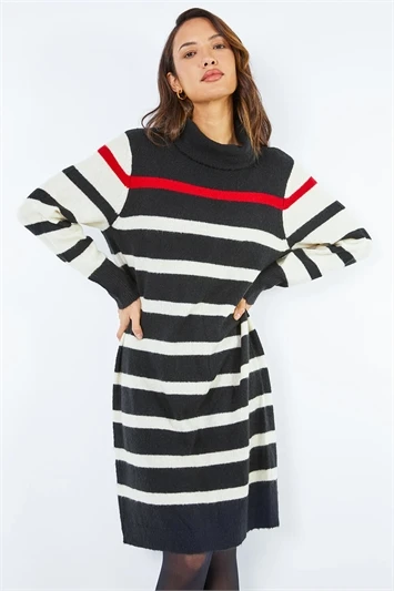 Add some simple sophistication to your wardrobe with this fitted day dress. Cut from a jersey fabric this dress falls at a fun knee length. It features warm, full length sleeves which are finished with ribbed cuffs and an unusual asymmetric turtle neck which drapes across the shoulder and is finished with metallic button detail. This is designed to pull on, overhead for easy styling. Add tights, boots and a gilet for a more chilled look or wear with heeled boots and a formal coat for an evening out!