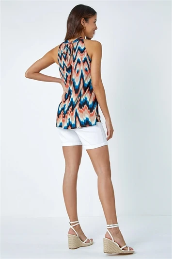 Be Summer ready in this vibrant halter neck dress. Made with a breezy stretch jersey fabric and cut into a sleeveless, knee length silhouette, this seasonal piece is as flattering as it is funky. Featuring a detachable fabric tie belt detail and a glamorous metal trim at the neck, this dress is ideal for any of your weekend plans. Pair with a black wedges and you’re holiday ready in a flash!