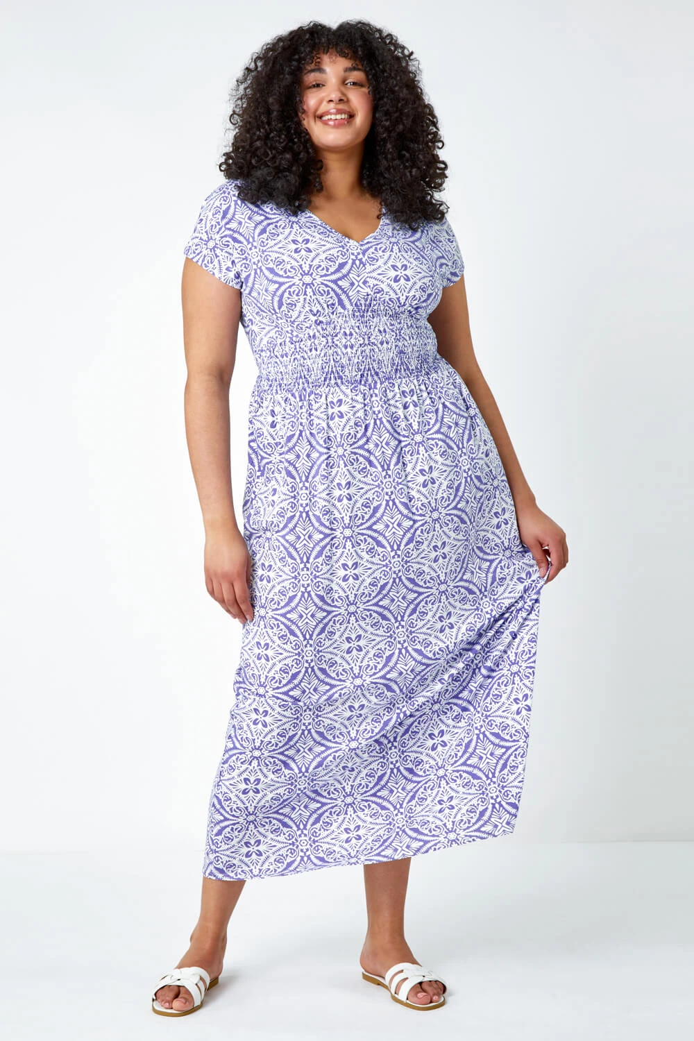 Add some pretty prints to your Curve collection with this aztec print t-shirt midi dress. Cut from a comfortable stretch jersey fabric this dress features a feminine v neckline & sweet short sleeves. A shirred waist ensures comfort and creates shape, while the skirt falls in soft pleats to a modest midi length. Pair with a denim jacket and sandals for effortless holiday style.