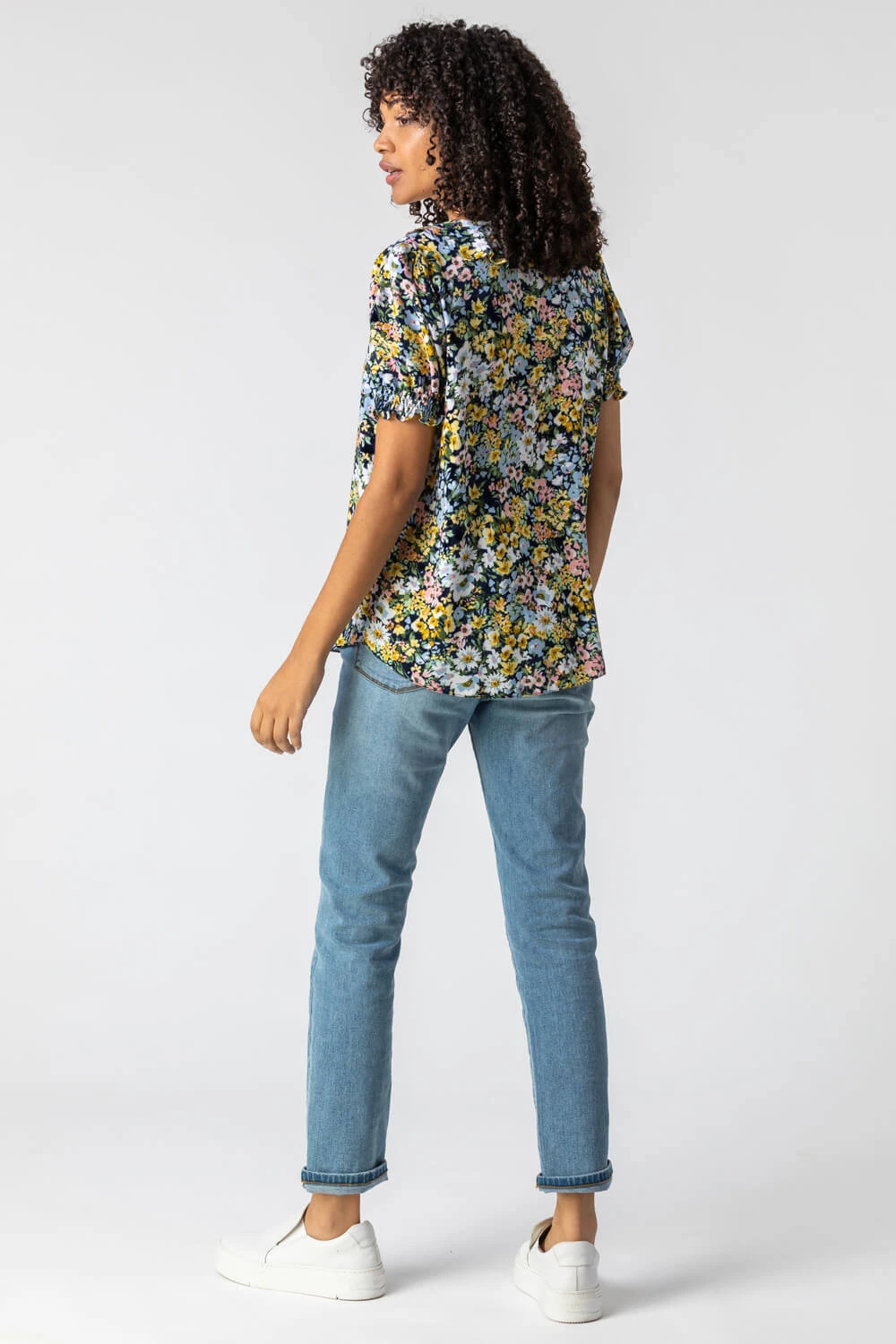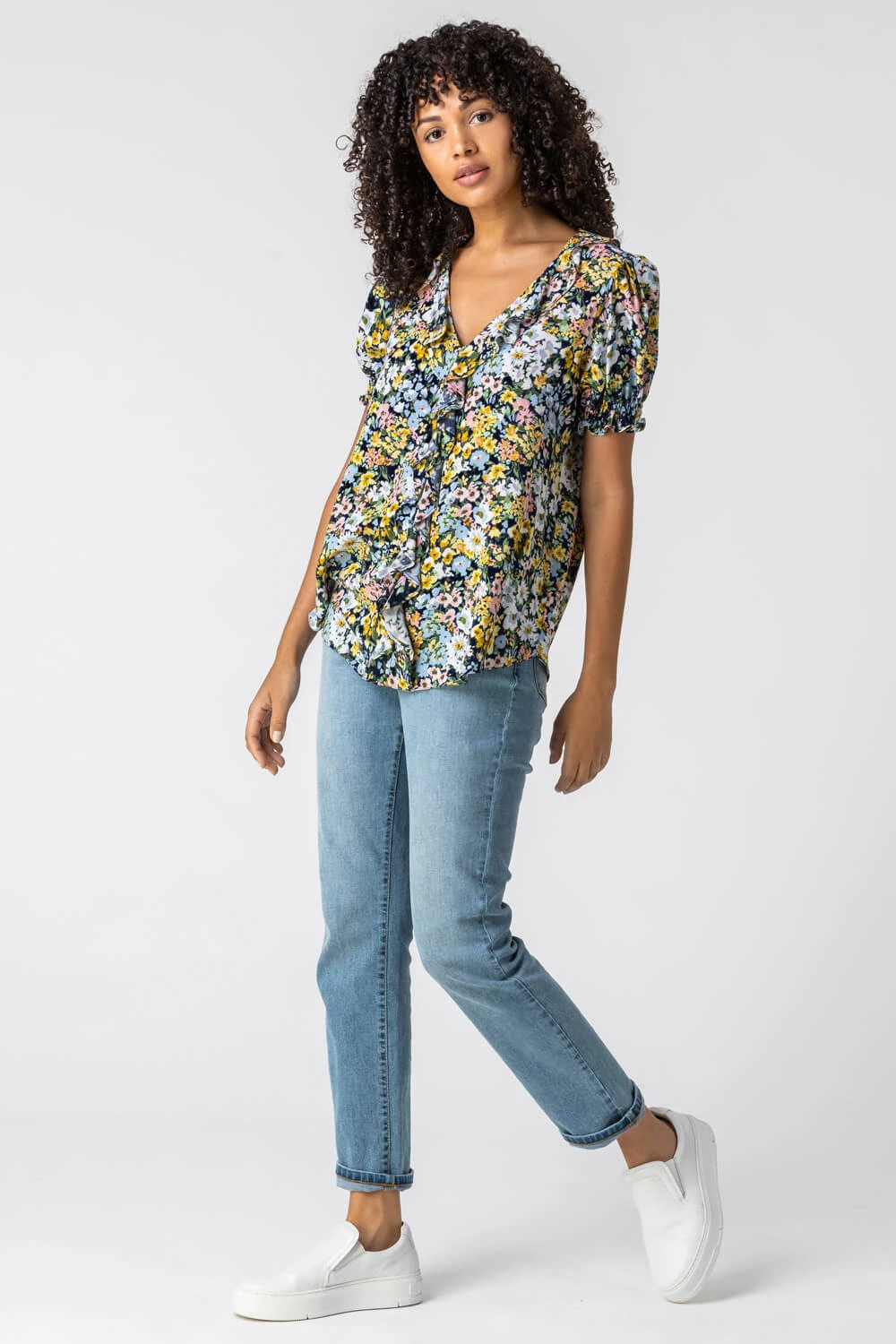 Florals and frills to thrill! Embellished with gorgeous frills at the front and across the neckline, this feminine top can be dressed up for any occasion. This v-neck short sleeve top is the perfect addition to your suitcase for your travels. Finish the look with black denim and switch to smart culottes for the perfect day to night ensemble.