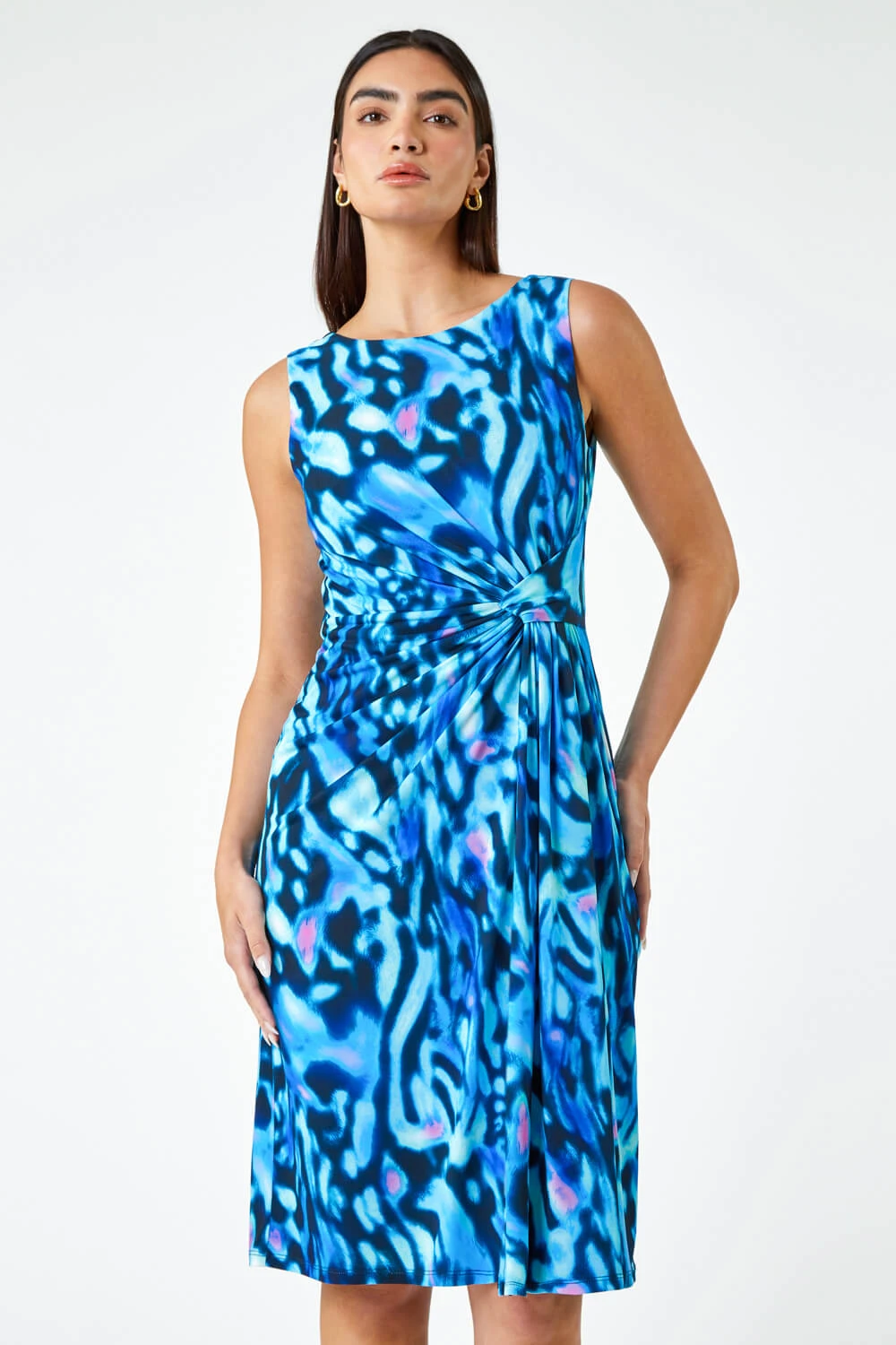 Take a walk on the wild side with this wrap detail knee length dress. Adorned in an abstract animal print that’ll be sure to wow your party guests, this subtle fit and flare dress is the perfect choice for any Summer occasion. Detailed with gathered draping from the waist, a classic round neck and a v-back, this easy to pull on dress has a stretch fabric that is so comfortable. The sleeveless shape is perfect for the warmer season whilst the twist detail cinches you in. Pair this piece with some strappy heels for a look that screams Summer glamour.