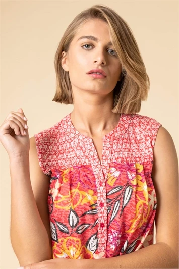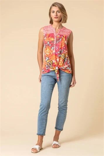 Adorned in a pretty paisley print this relaxed shirt top is a must have Summer staple. It features a notch neckline and is designed in a collarless shape. Short sleeves ensure a cool and comfortable fit, while a partially open front is finished with cute button fastenings. It’s cut from a burnout, woven fabric adding further print and texture to the piece. Finished with a tie front hem this piece is perfect paired with relaxed jeans and sandals!