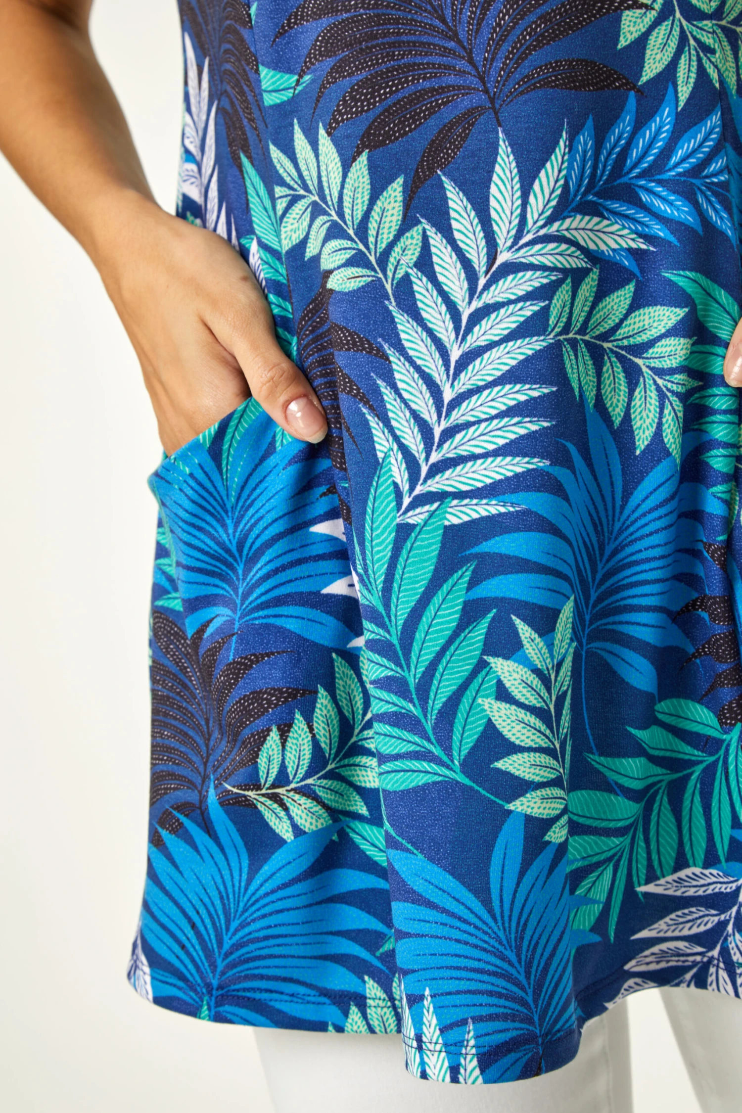 Add some fun tropical prints to your everyday collection with this palm print tunic top! Cut from a stretch jersey fabric, this top features a modest round neckline and simple short sleeves. A bright, palm print adorns the piece, while pocket detail adds a playful yet practical edge. Designed in a relaxed tunic shape this top is perfect paired with cropped jeggings and trainers!