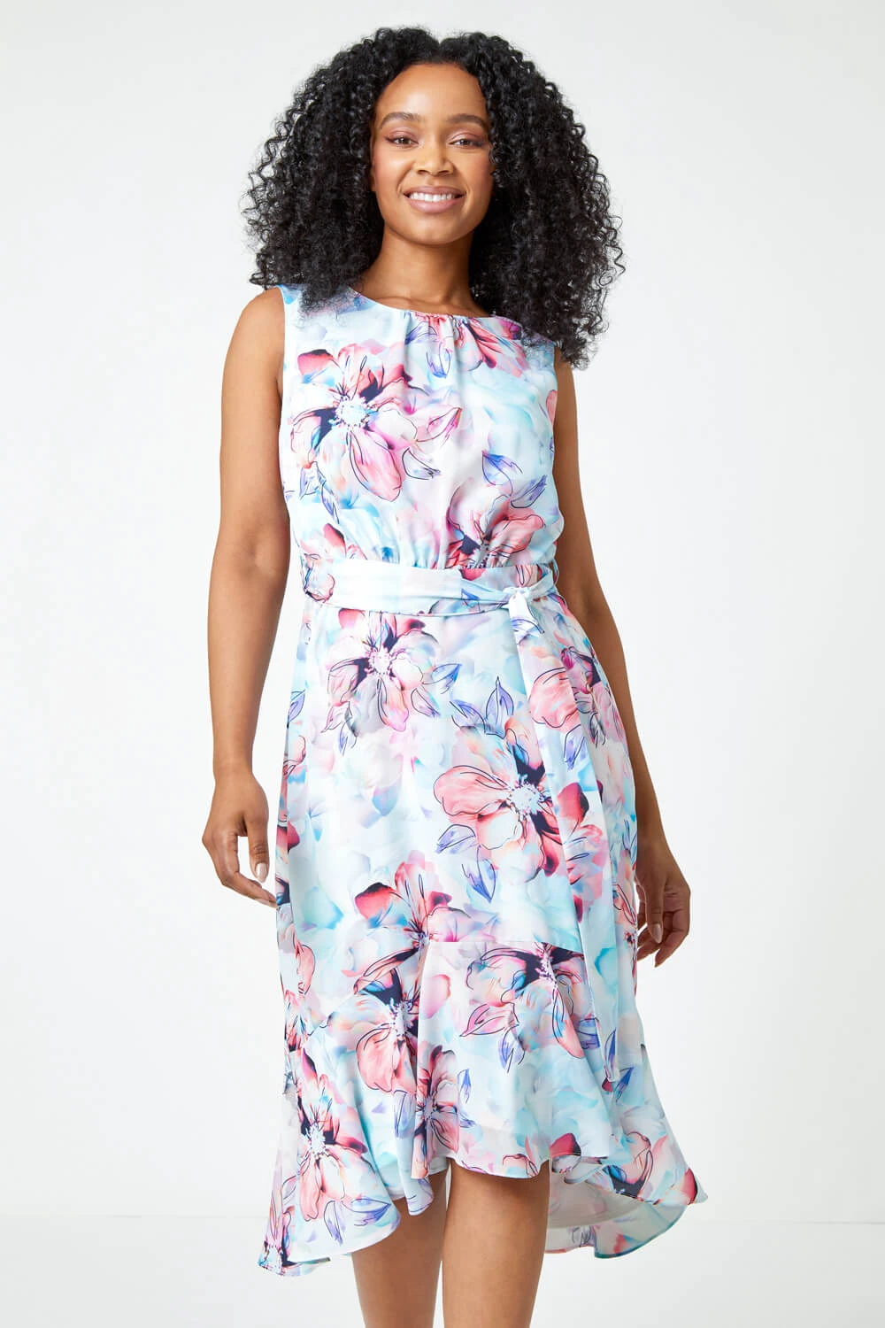 This petite dress is adorned in a pretty, floral, watercolour print. It features a modest round neckline complete with flattering pleats and is designed in a sleeveless style. A self-tie fabric belt adds shape if desired, while the fit and flare skirt falls to a midi length and is finished with a fun frill hem. Finished with a concealed back zip, this dress is perfect for any Summer occasion!