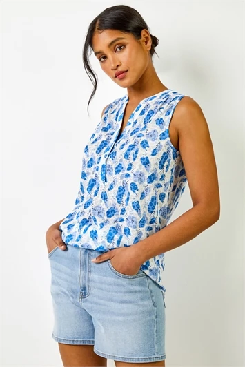 An abstract floral print in a bright on trend colour adorn this cool, sleeveless vest top. Cut from a smooth, woven fabric this piece features a feminine v neckline and delicate ladder lace detail. Designed to pull on overhead this piece is perfect paired with cropped stretch trousers and sandals!