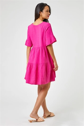This piece boasts an intricate tile print in complimentary, on trend colours to create a striking a – line dress. Cut from a smooth, woven fabric this piece features a modest round neckline and short sleeves with cute frill cuffs. A relaxed waistband ensures a loose fit on the skirt which falls to a fun knee length. It’s designed to pull on overhead with no tricky fastenings and is finished with a feminine frill hem. Pair with fresh trainers and a denim jacket for a sweet Spring look!