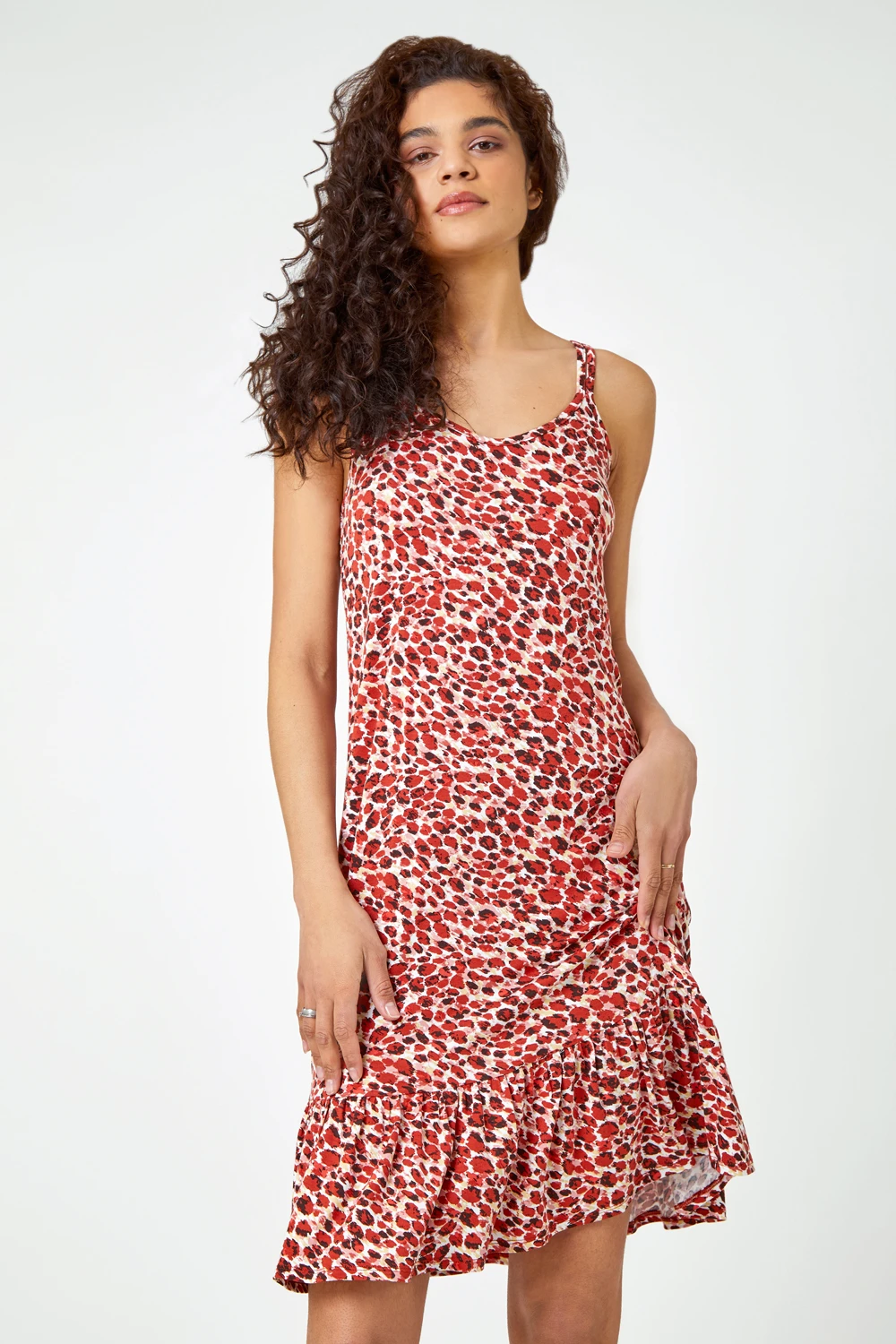 Get Summer ready with the help of this playful frill hem dress! Printed in a vibrant leopard pattern, this style has a relaxed fit and soft jersey body that is so easy to pull on and go. Finishing at the knee, this strappy dress has two thin cami straps and a v-neckline for a stylish edge. Reach for your favourite denim jacket and sandals to complete this must-have Spring look!