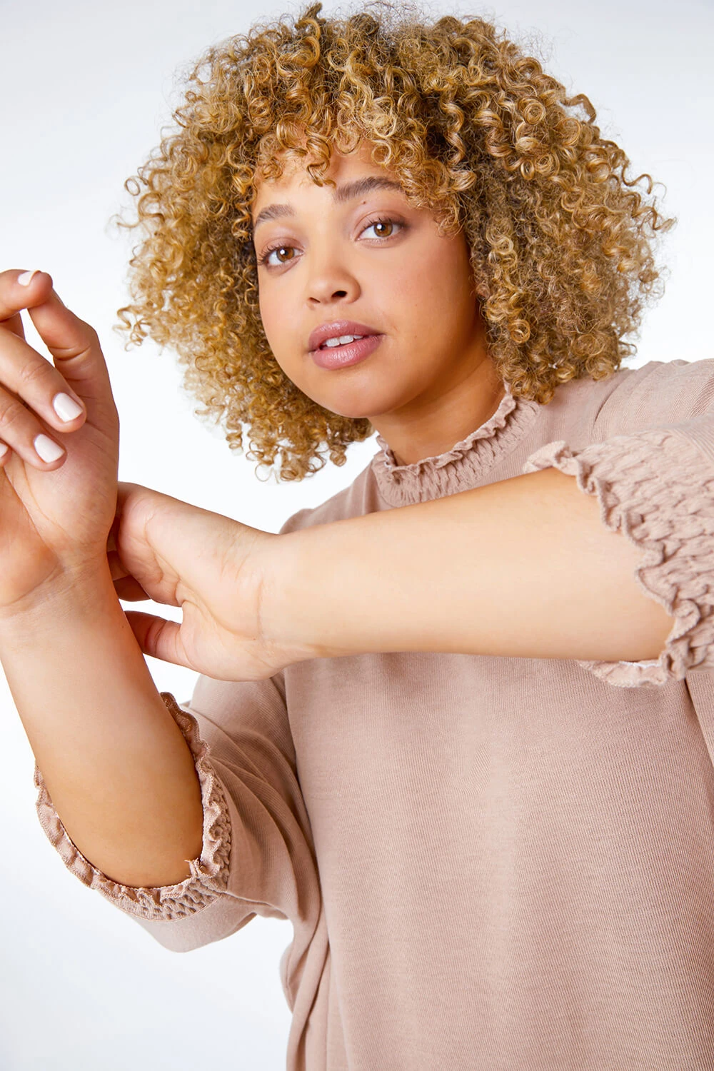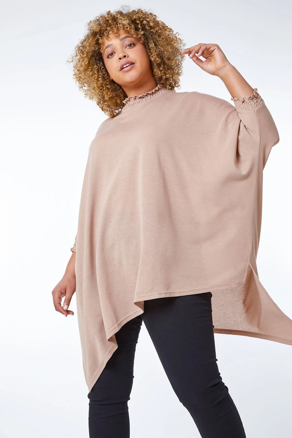 Another delicate curve number to add to your basics collection, this asymmetric stretch jersey top is feminine and fun. It features a slight high neck with shirred frill detail, 3/4 length sleeves that are finished with shirred cuffs and an unusual asymmetric hemline. It falls at a flattering thigh length providing that comforting extra coverage. Pair with curve mom jeans, boots and a gilet for a pretty Autumn look!
