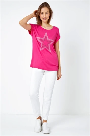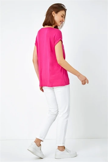 Basic t-shirts are a wardrobe necessity and this piece has an interesting edge with its burnout palm print yoke and sparkling embellishment. Cut from a relaxed, jersey fabric, this piece features a modest round neckline and short sleeves. Designed to pull on overhead this top is perfect with cropped stretch trousers and sandals for an effortless Summer look!