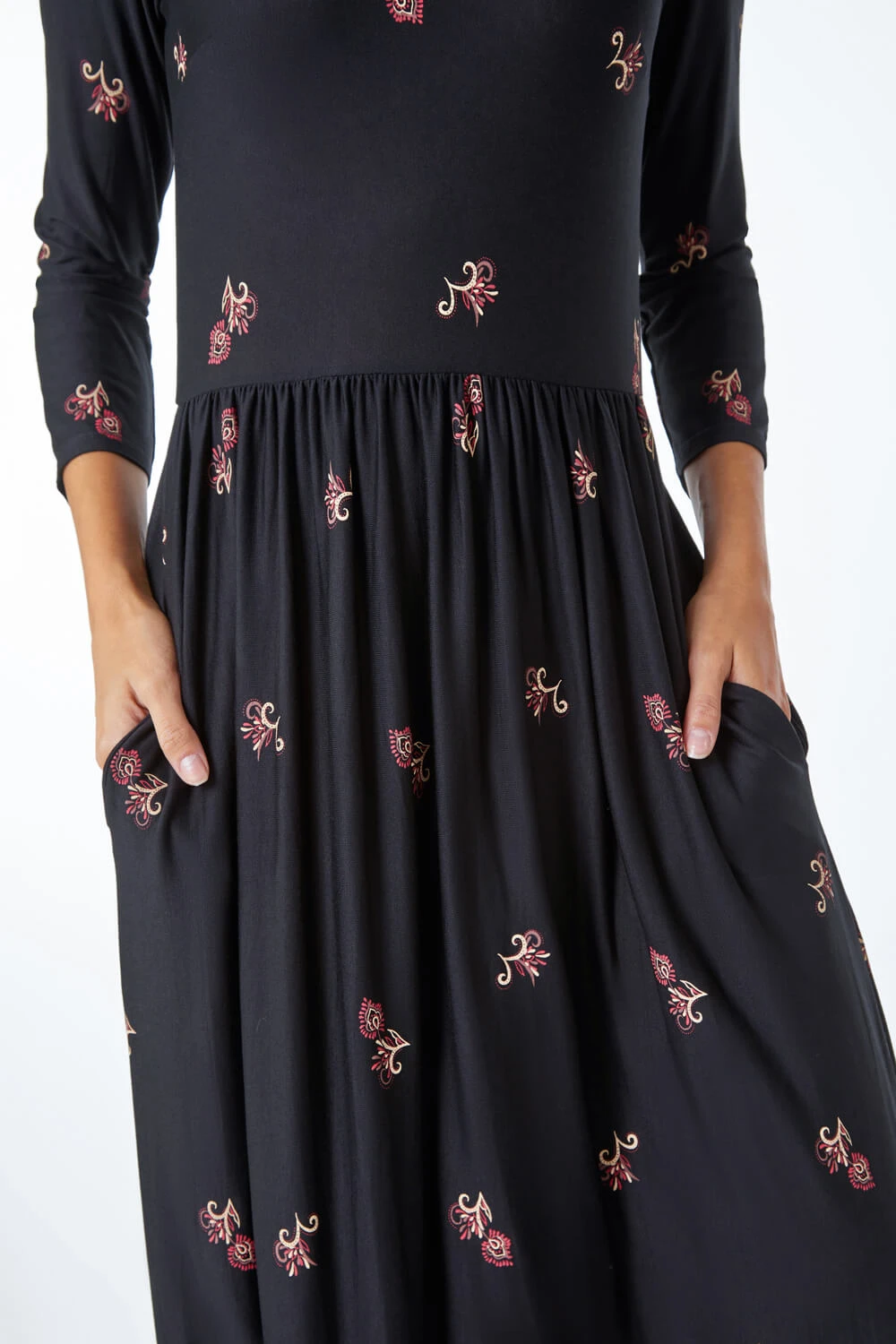 Tune into the boho babe trend this season! A great essential addition to your casual wardrobe, this versatile dress is a must-have for this autumn. Designed in a relaxed fit & flare shape, this border print maxi features a gathered skirt and 3/4 sleeves. Easy to pull on and wear, team yours with trainers and a faux leather jacket for a casual look to take you through the day.