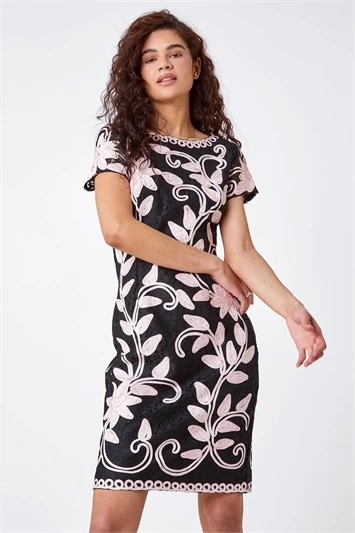 This two piece lace set by Julianna is great for Spring Summer events. This midi length dress can be worn on its own or with the matching cropped 3/4 sleeve jacket. The scallop hem dress boasts a flattering v-back and floaty overlay skirt with a full lining. This set comes complete with jacket and strappy princess line dress. Style with the matching lace cover up, a fascinator and heels for a wedding guest ensemble or for a day at the races!