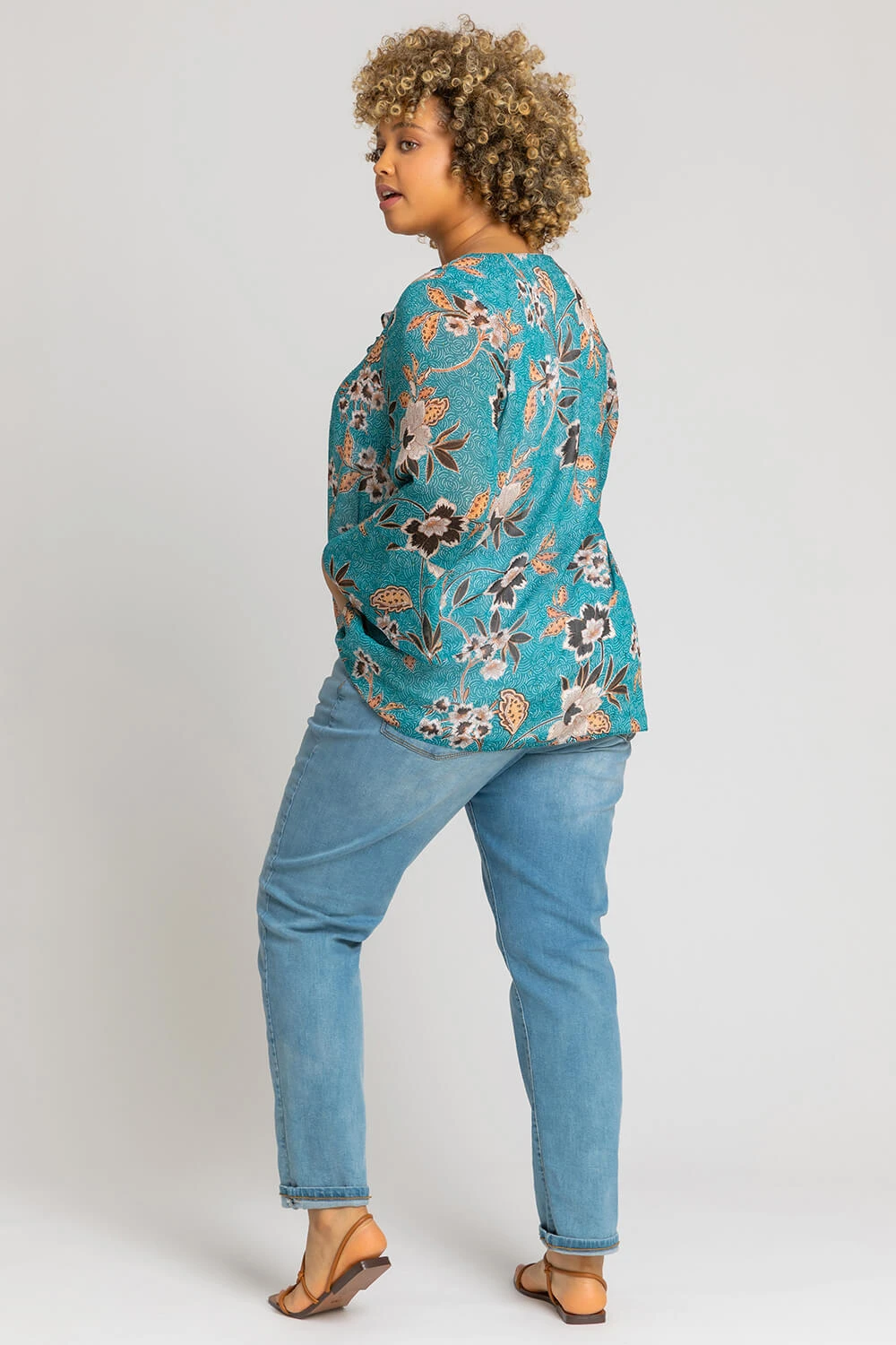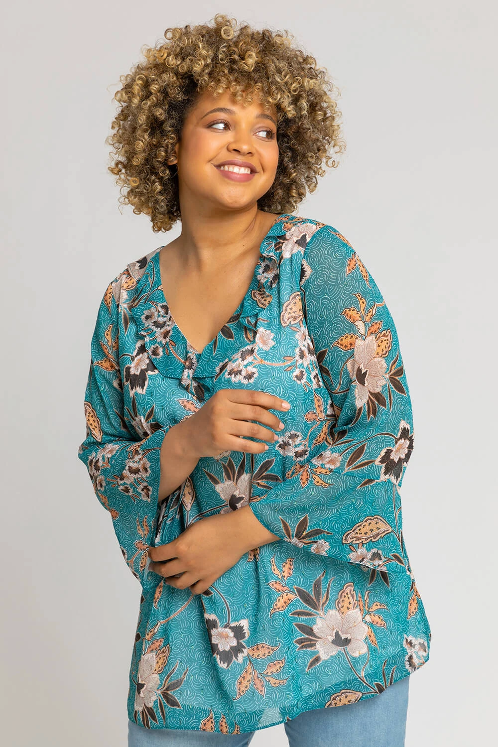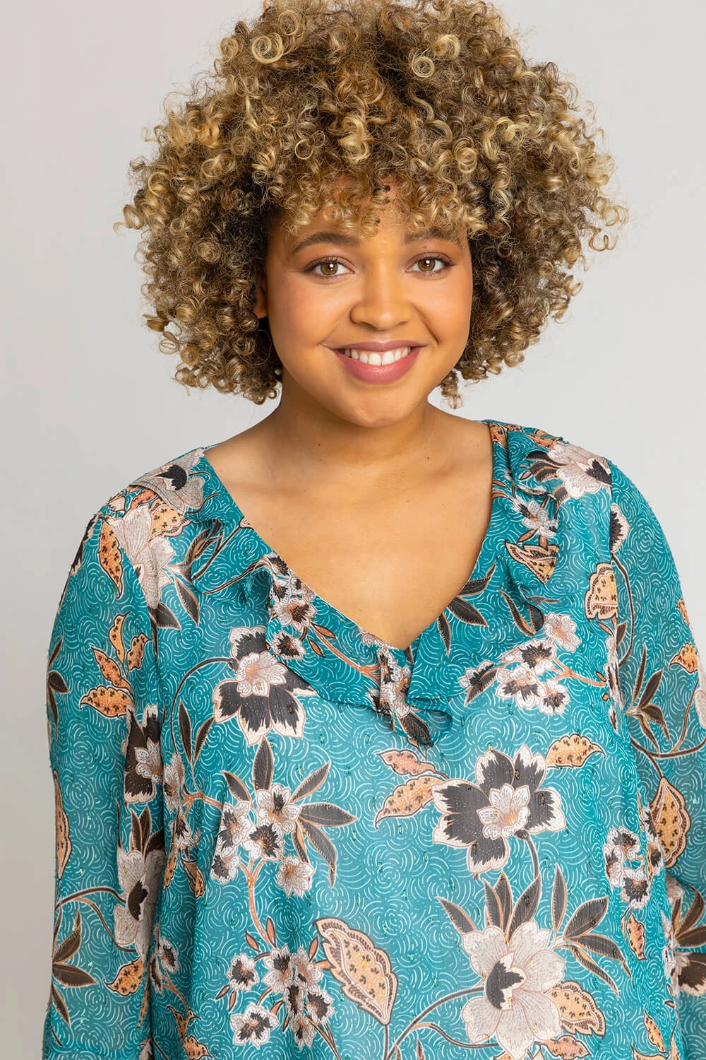 This season you can look flawless in your florals with our bright printed collection. With a bold floral print, this printed top is fully lined and has a textured spot woven throughout. Featuring a v neckline, this top has an elegant frill detail to the cuffs and neck with a metallic fibre woven through the material. Pair with your shorts and sandals for a holiday look or dress up with skinny jeans and heels for an outfit to take you to the party.