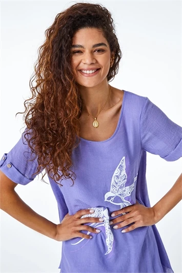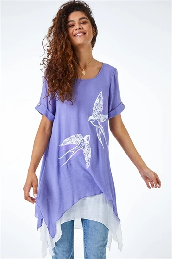 Update your Spring casual-wear with this versatile wardrobe staple. Featuring a floral dandelion print and contrast asymmetric hemline, this tunic top is made from an easy breezy lightweight material. The short sleeves are finished with a delicate button detail whilst the flattering hanky hem silhouette is brilliantly flattering on all. Throw this over your favourite cropped trousers for a Summer holiday or jersey leggings for an everyday go-to style.