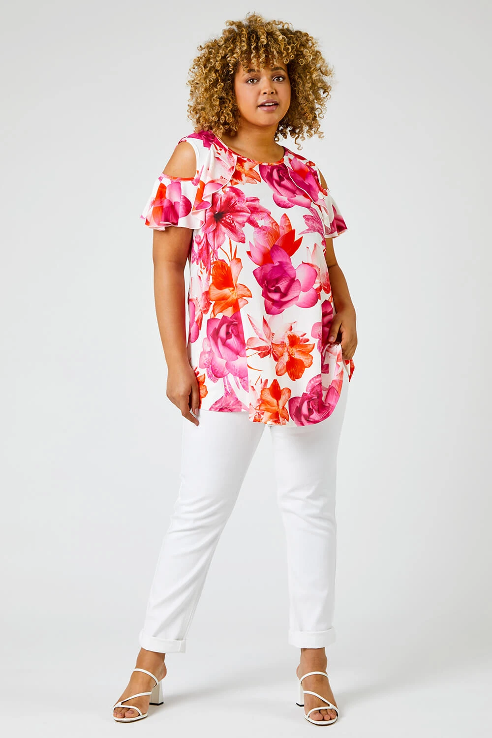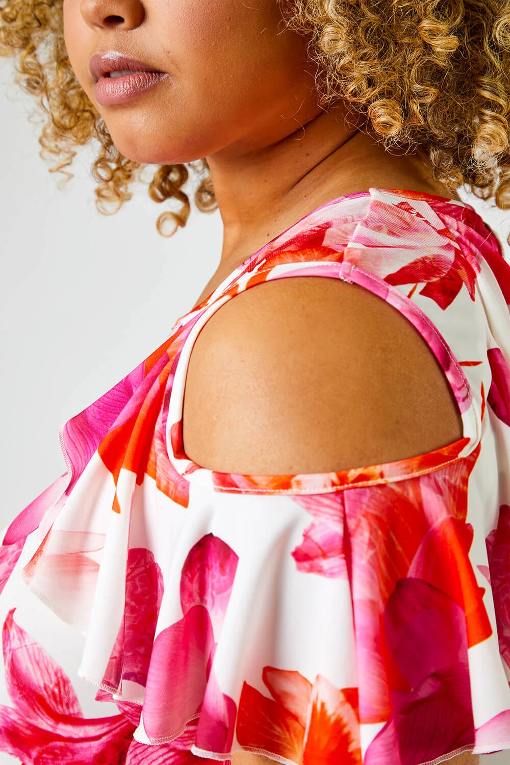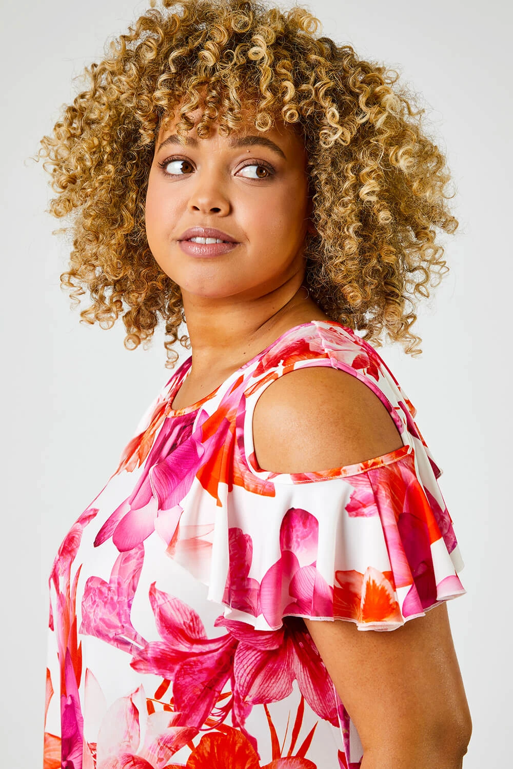 Summertime florals and timeless silhouettes adorn this must-have wardrobe staple. Created with a round neckline, flowing into a cold shoulder with frill detailing, this little number skims your body creating an ultra flattering silhouette. Add this stunning piece to your spring-summer collection, styled with crops or jeans, pair this with sandals for a more casual look, or heels and light accessories for a summer nights out with the girls.