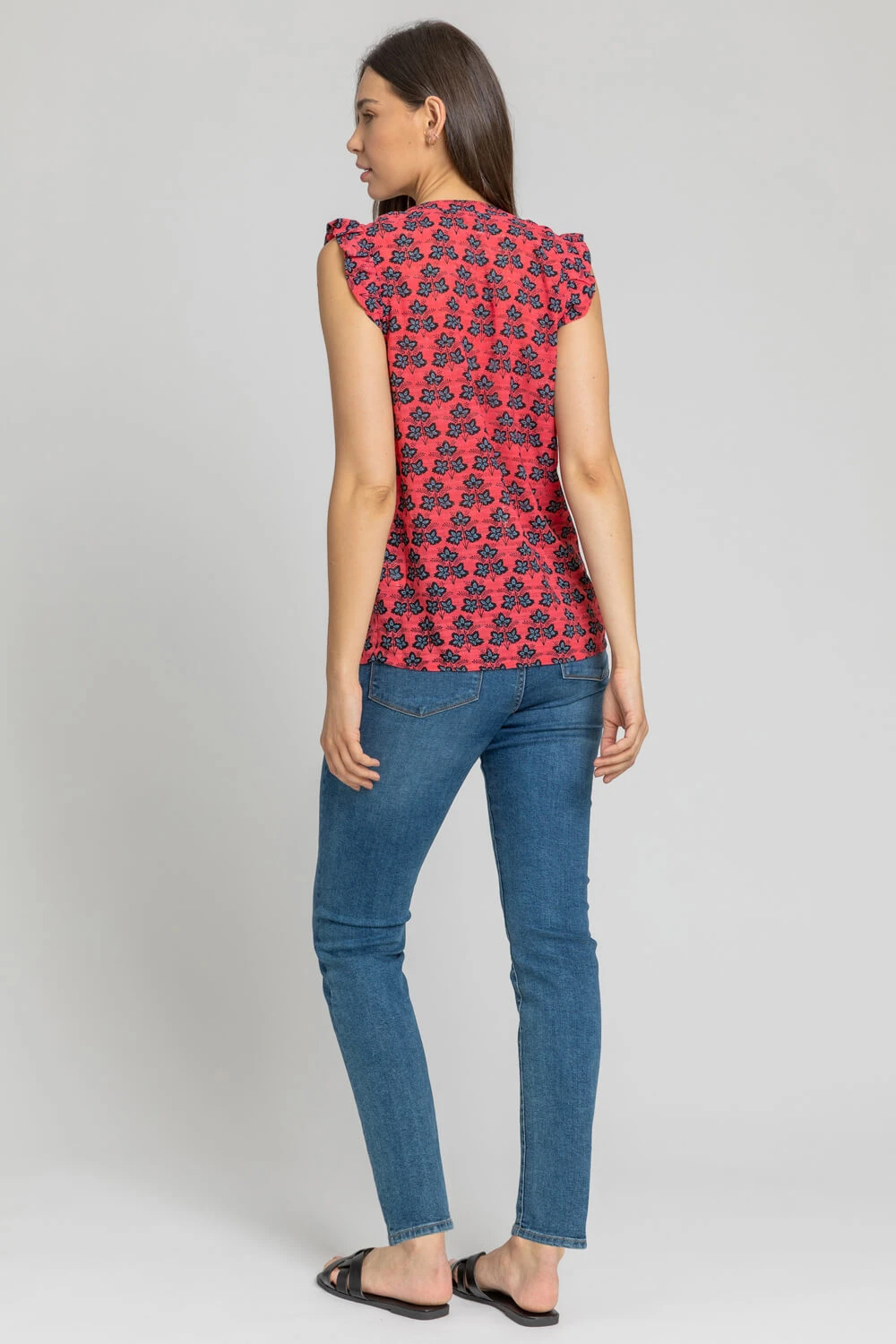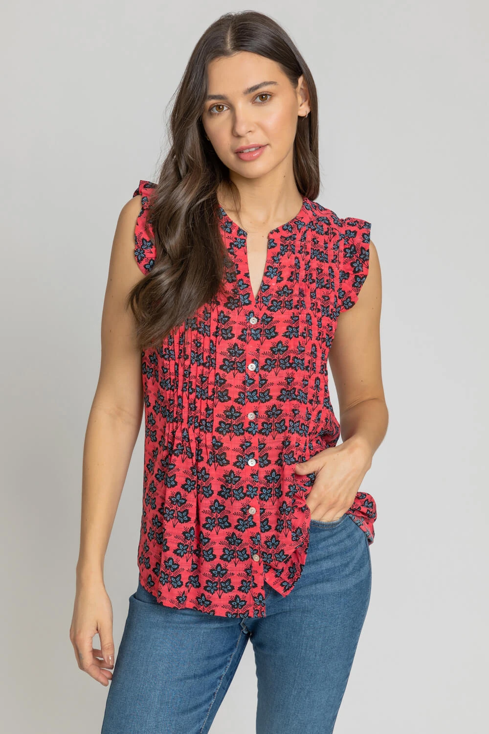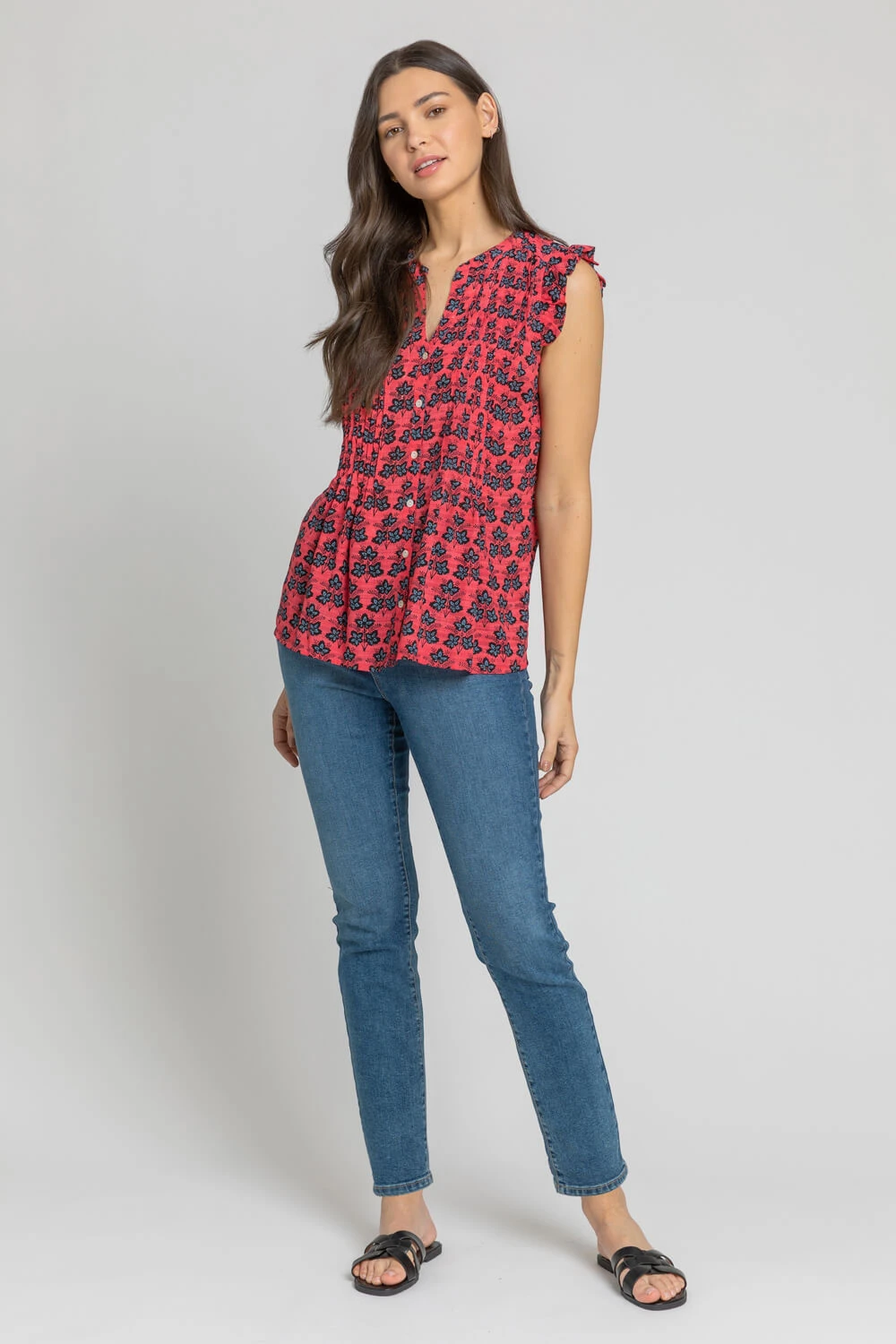 This sweet sleeveless style is adorned in a unique floral print and features a feminine notch neckline. A fully open front is completed with cute button fastenings. A frilled trim frames the shoulders adding a delicate touch. Cut from a cool woven fabric this piece is perfect for the warmer weather. Pair with relaxed denim and sandals for an effortless Summer look!
