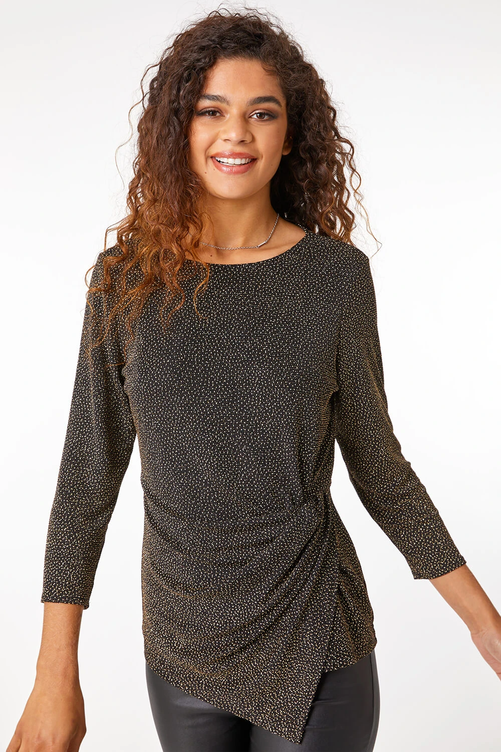 Add some sparkle to your party wear this season with this side twist, ruched top. Cut from a stretch jersey, glitter fabric this piece features a modest round neckline and fun ¾ length sleeves. It has a flattering side twist which creates complementary ruching across the body and onto the wrap hemline. Pair with leather look trousers and heels for a party perfect look!