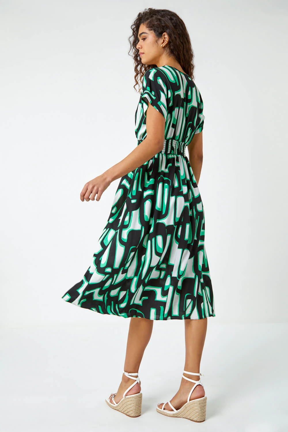 Experiment with some new prints this season with this abstract, geometric print midi dress. Cut from a cool, woven fabric this dress features a feminine v neckline and relaxed, short sleeves with cuffs. A ruched waist creates shape while the fit and flare skirt falls to a modest midi length. Its unusual print in on trend colours really catch the eye. Add heeled wedges for those long Summer nights with friends!