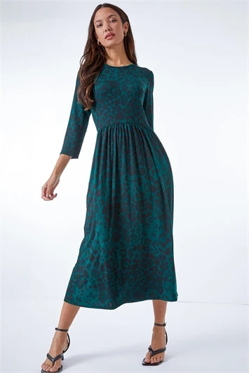 A must have for everyone’s Summer wardrobe, this stretch jersey midi dress is versatile and comfortable. Cut from a soft, stretch fabric this dress features a modest round neckline and short sleeves, perfect for the warmer weather. An elasticated waist creates flattering pleats which fall to its midi length hem. Adorned in a ditsy, floral print this piece is designed to pull on overhead, making it perfect for busy Summer days and last minute plans. Pair with fresh trainers or sandals and add a light weight denim jacket for the perfect laid back outfit!