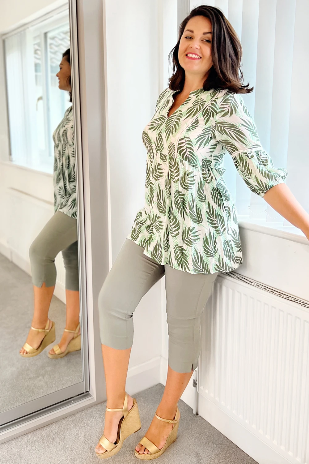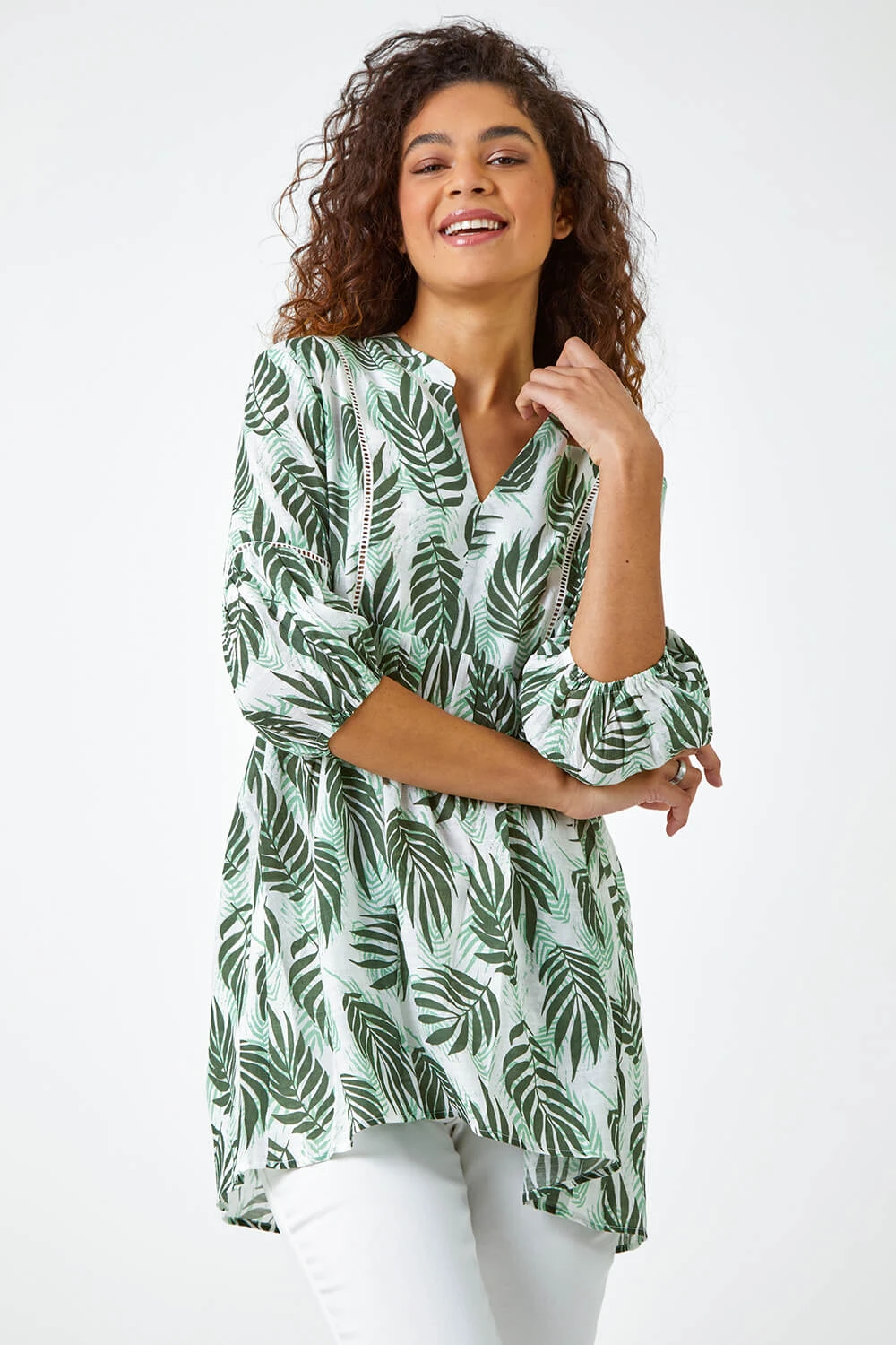 Relaxed fits and colourful natural prints are the perfect combination for your Summer wardrobe and this smock tunic has both in abundance. Cut from a cool, woven fabric this piece features a feminine notch neckline and ¾ length tiered, puff sleeves finished with elasticated cuffs. A relaxed waistline ensures a flattering, smock fit throughout the longline piece. Adorned in a bright leaf print this top also features delicate ladder lace detail across the chest and on the sleeves. Add cropped jeans and sandals for effortless boho style!