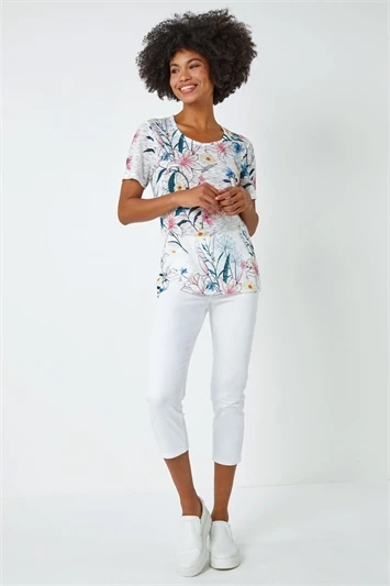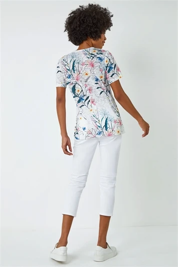 Adorned in a pretty palm print, this stretch jersey top is perfect for the Summer season. Cut from a breathable fabric this piece features a modest round neckline with contrast binding and simple, short sleeves. Added diamante embellishment adds the perfect finishing touch and will sparkle beautifully in the Summer sun. Designed in a flattering tunic length, this top is perfect paired with our cropped jeans and trainers for effortless Summer style!