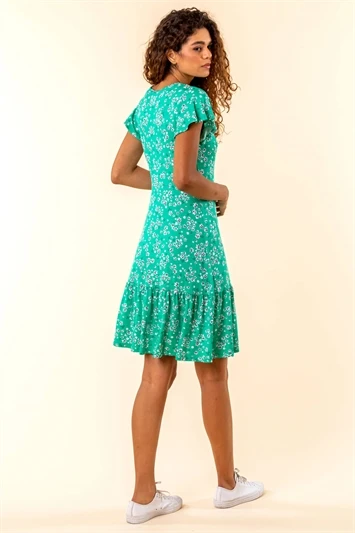 Get garden party ready with this Petite printed dress. Cut from a smooth woven fabric this dress features a feminine v neckline adorned with a floaty ruffle trim. Designed with sweet short sleeves this dress is adorned in a ditsy floral print. The wrap style, knee length skirt is trimmed with delicate frills adding texture and movement throughout the piece. Pair with a denim jacket and heeled wedges for effortless Summer style!