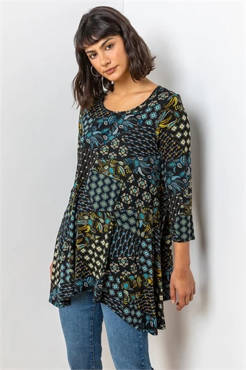 Hanky hem tunic tops are a great way to add longline styles to your wardobe and this short sleeve number is adorned in a textured, floral print. Cut from a stretch jersey fabric this top features a modest round neckline and sweet, short sleeves. Designed to pull on overhead, this piece features a delicate ditsy print with a slight texture running throughout. Pair with cropped jeans and sandals for a laid back look!