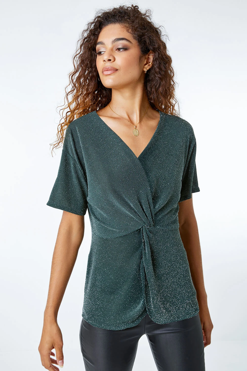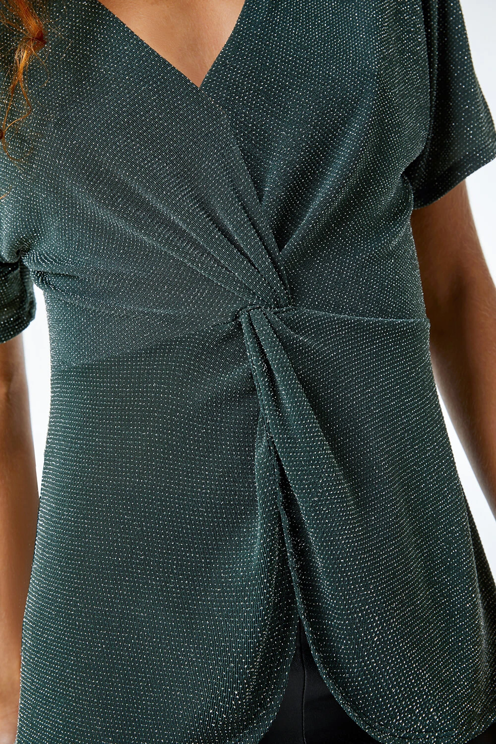 Make sure your autumn style is all wrapped up with this twist front metallic top. Featuring short sleeves and a deep v neckline, this elegant take on a tee is made from a stretchy glitter fabric and is complimented by a knot twist at the front. Team with smart faux leather trousers and heels for a statement party look.