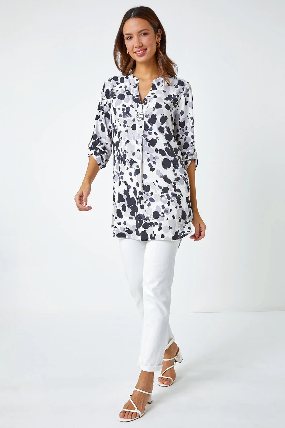 Abstract prints are key this season and this longline tunic showcases them in a subtle yet stylish way. Designed in neutral colours this piece is versatile and classic. Cut from a smooth, woven fabric this piece features a notch neckline and ¾ length sleeves with adjustable tabs. A metallic feature button detail adds the perfect finishing touch. Pair with smart separates for work or add jeans and heels for a night with the girls!