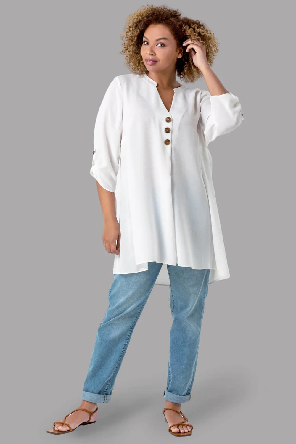 Keep cool and look cool in our latest contrast button top. Our V-Neck blouse is cut from a lightweight material into a relaxed fit to flatter any figure. Perfect for your casual days, this 3/4 length sleeve shirt will be a holiday suitcase must-have. Match this relaxed fit essential with your favourite casualwear looks or dress up for an evening style with heels and black trousers.