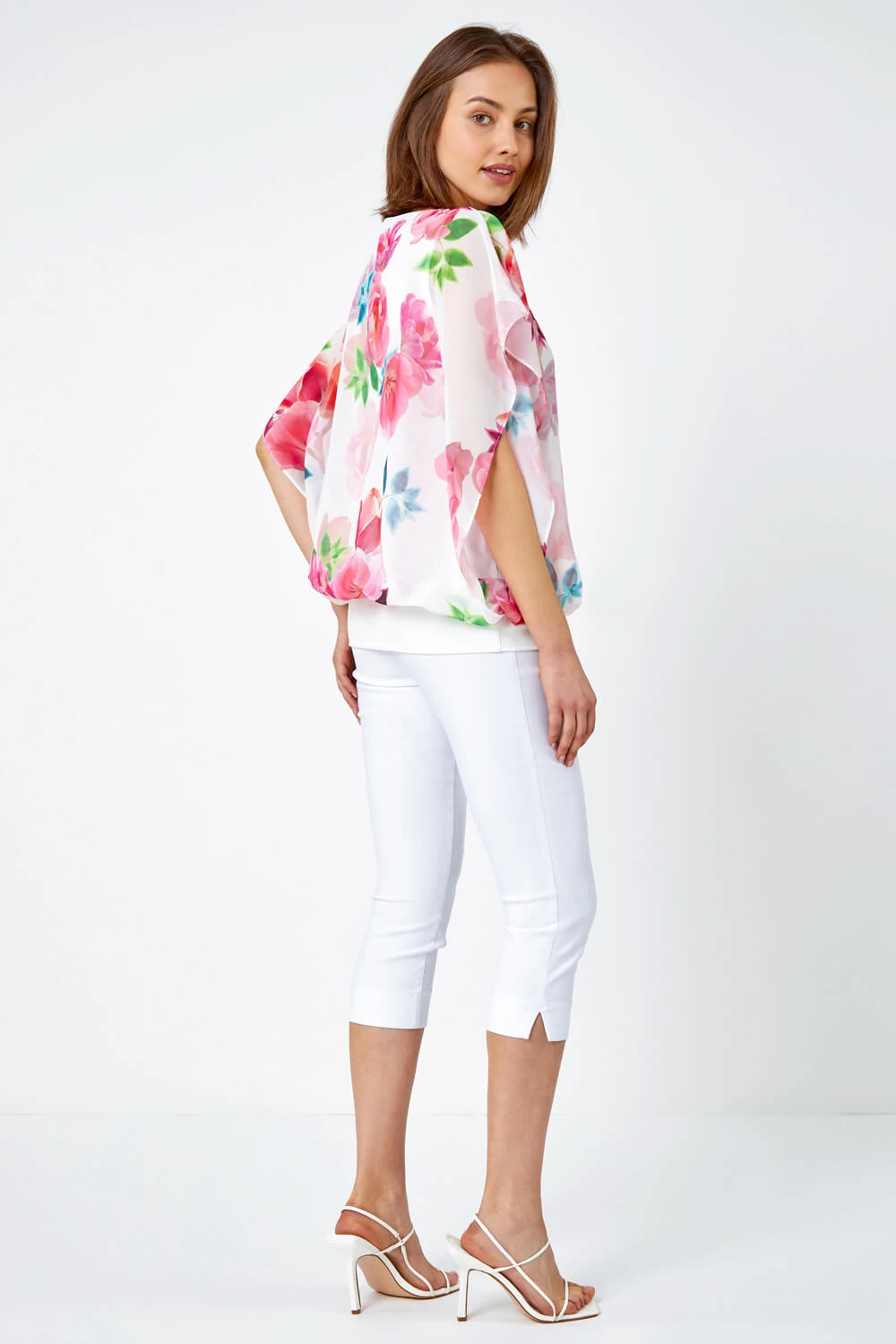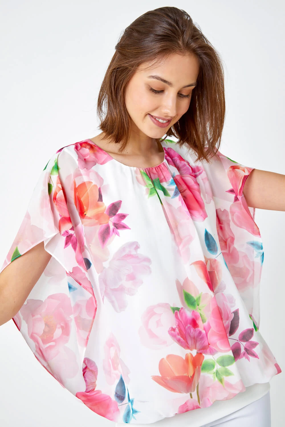 Make a style statement in this floral print overlay top. Cut from a smooth woven fabric this piece features a modest round neckline with flattering pleating and sweet short sleeves. Adorned in a pretty, floral print this top has a floaty chiffon overlay with a soft, stretch jersey underlay, providing both style and comfort. Its finished with a flattering and secure banded blouson hemline. Simply pull on overhead and pair with our cropped stretch trousers and barely-there heels for a sweet and sophisticated look!