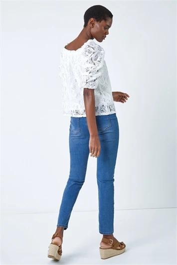 Add some versatile pieces to your Summer collection with this plain, lace trim bardot top. Cut from a smooth woven fabric this top features a flattering shirred, bardot neckline for a smooth and comfortable fit and short sleeves trimmed with an intricate lace edge. Flattering pleats at the chest ensure a loose and relaxed fit throughout. Finished with a matching lace trim at the hemline, this top is perfect paired with relaxed denim and sandals for effortless Summer style!
