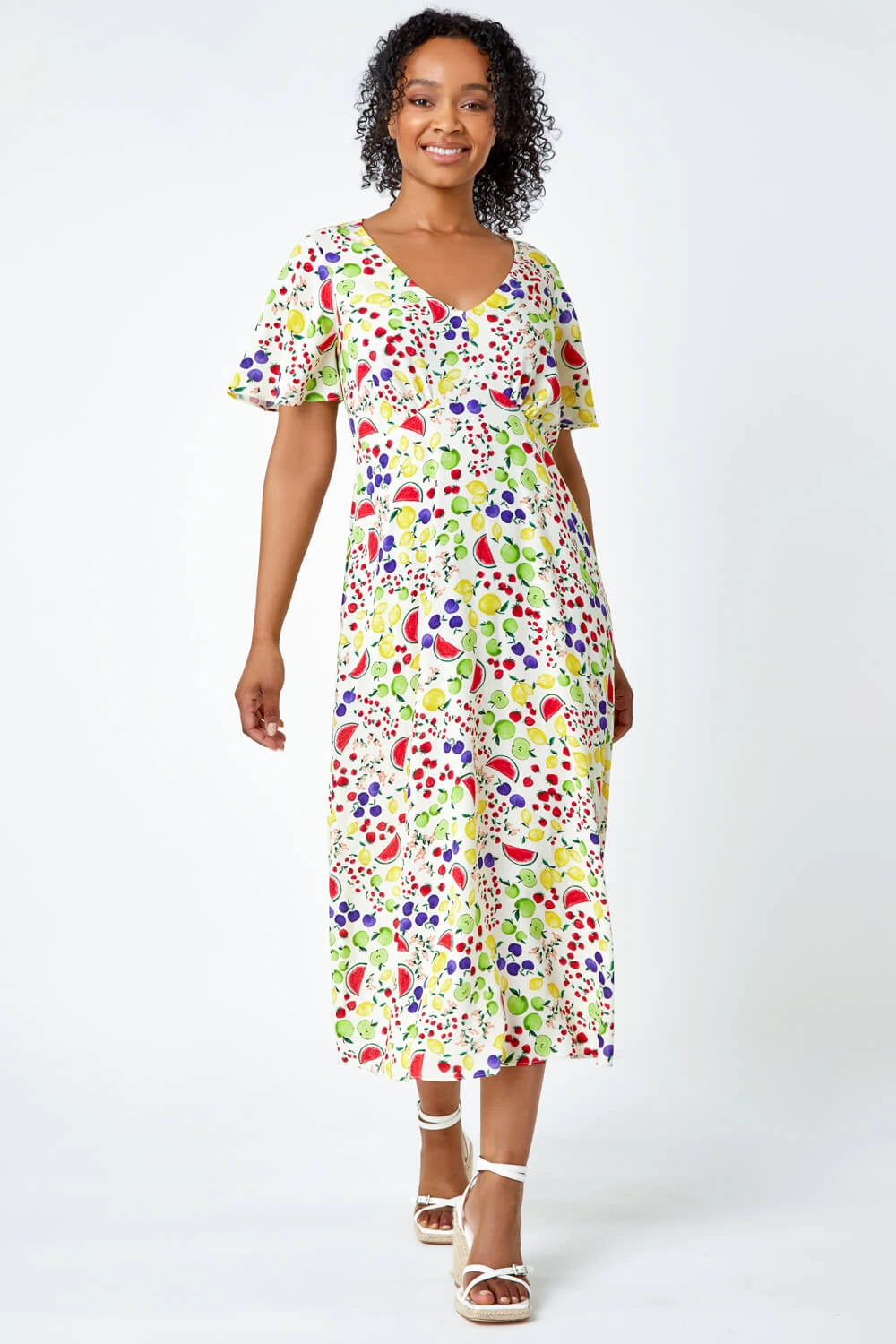 Have some fun this season with this playful Petite, fruit print tea dress! Cut from a smooth woven fabric this dress features a feminine v neckline and short angel sleeves. An empire waistline ensures a flattering fit throughout, while the skirt falls to a modest midi length in a classic fit and flare style. Pair this piece with a lightweight jacket and heeled wedges for bold Summer style!