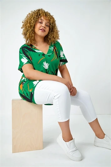 Be seen in green with the help of this vibrant leaf print top. A bold new addition to the Curve collection, this v-neck top has an elasticated balloon style hem with a unique tuck detail at the front and dipped hem at the back. Cut to a flattering tunic shape, this short sleeve tee can be worn for so many occasions! Reach for white jeans and wedge heels for an evening look this Summer or style with a denim jacket and jeans for an off-duty casual outfit.