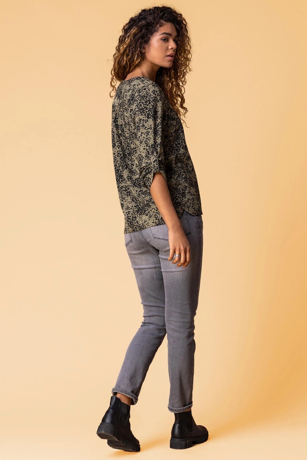 An abstract floral print in a ditsy pattern finishes this quirky zip detail top. Finished with a flattering v-neckline with a functional zip embellishment, this everyday blouse has 3/4 length sleeves with tabs. Pair this with smart trousers for the workplace, or dress it up with faux leather leggings for an evening dinner. If you love this print, why not get the matching midi dress?