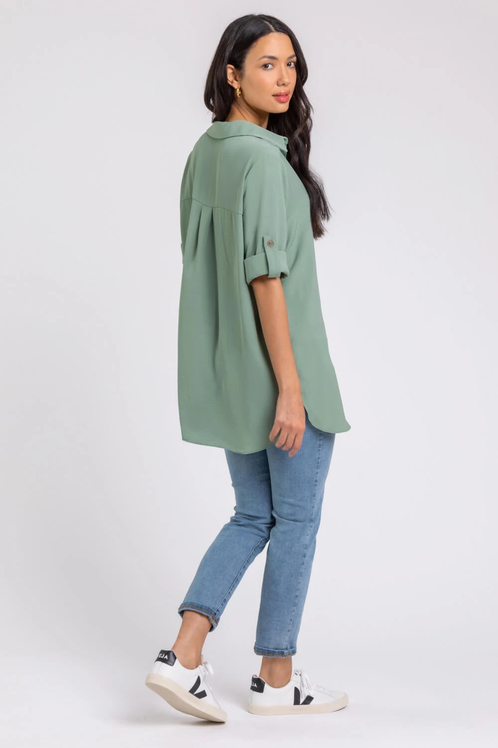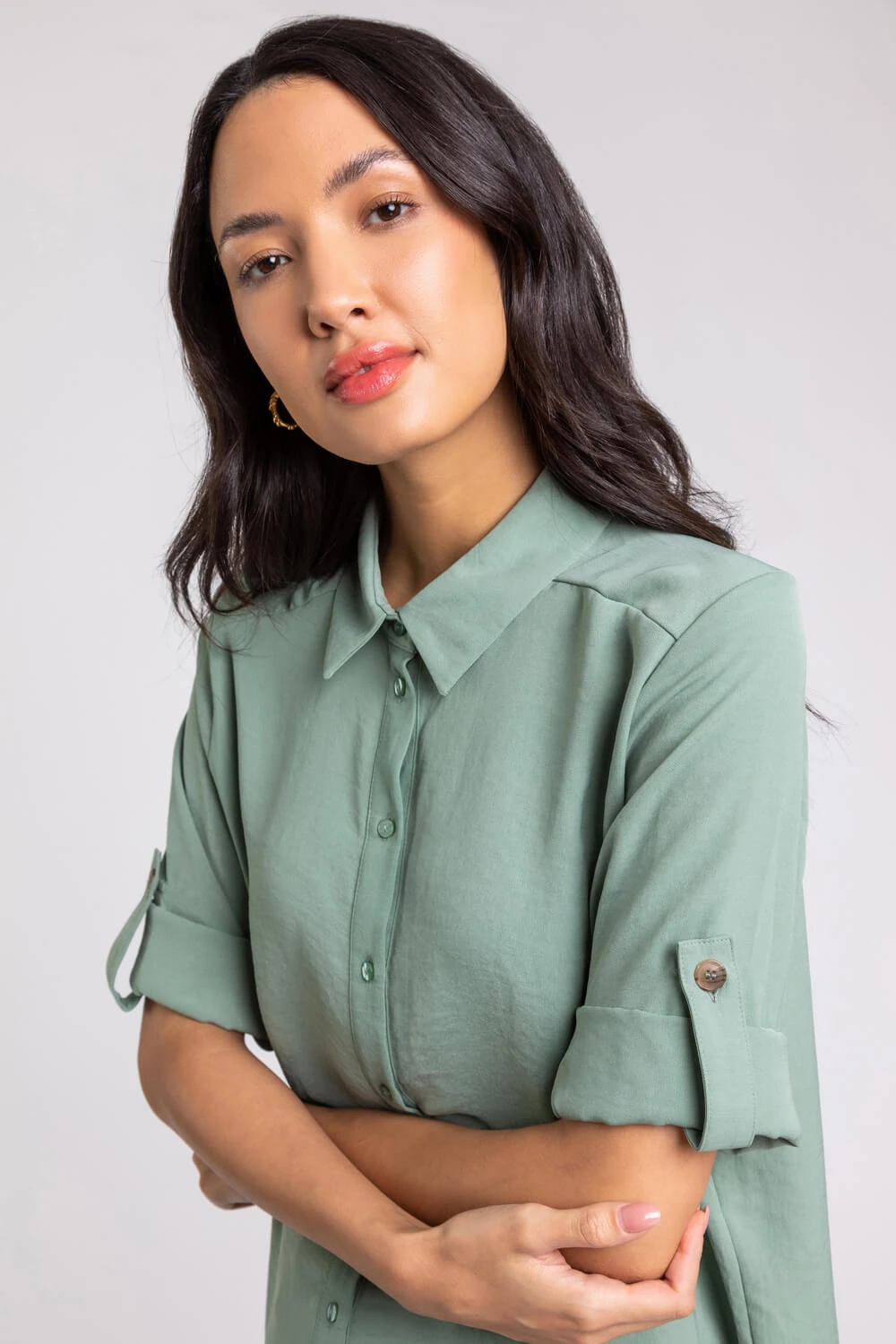 Upgrade your essential collection with timeless shirt styles in lightweight materials. Completed with button fastening down front, this classic silhouette has a shirt collar and short sleeves fastened with a tab detail to the side. Finished with a soft curve to the hem, this longline number is the perfect staple piece for any look. Add this classic blouse as a layer under jumpers or cardigans, alternatively add statement jewellery and heels for a ‘drinks with the girls’ style.